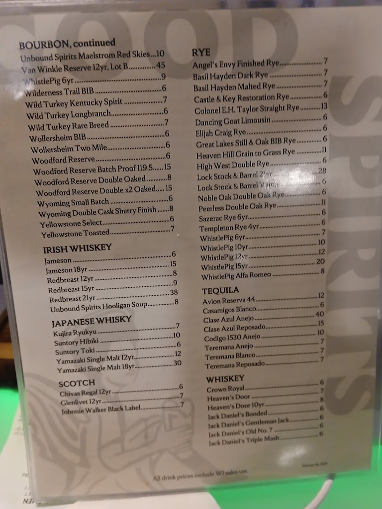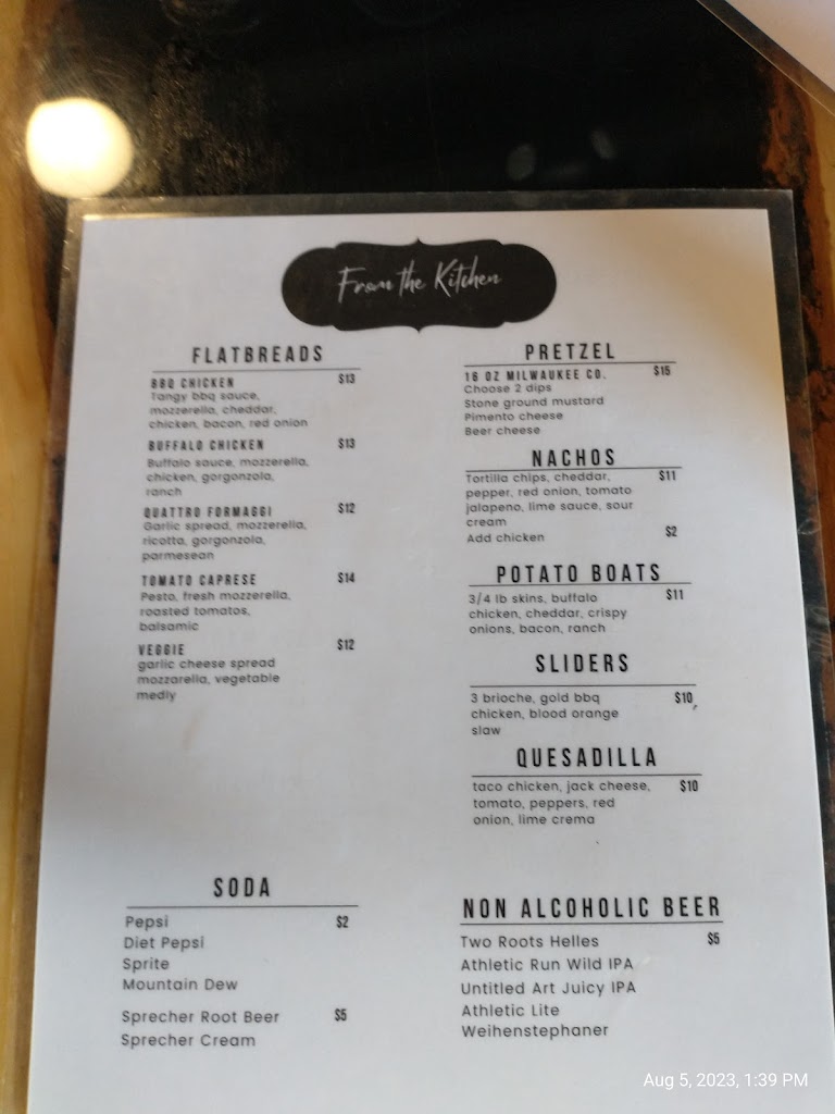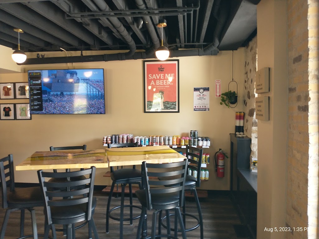 Amazing place for coming and tasting beers! More of a low key place almost like a cigar lounge. The view of the Rubicon River downtown Hartford from the building is amazing and you can see the waterfall from the back patio of the Hartford Mill Pond its so beautiful! They have just a couple different things for light finger food such as Flatbreads, nachos that are amazing! And a few other things. They have 2 big screen tvs that have all the beers they offer which are smaller craft breweries and a nice variety! They do have some cocktails but not a full liquor bar, it is mostly popular sipping whiskeys and such.