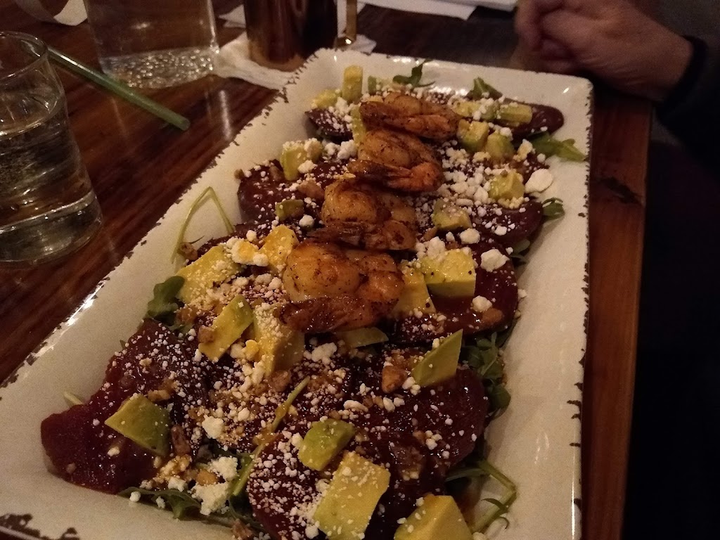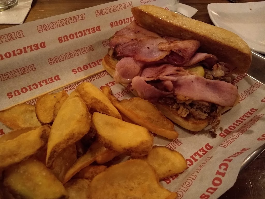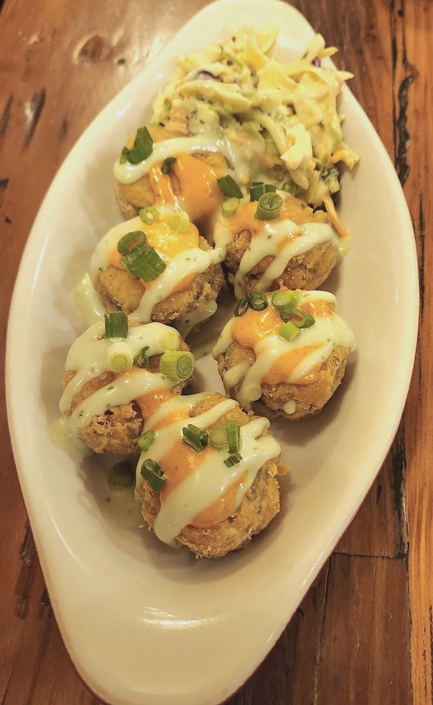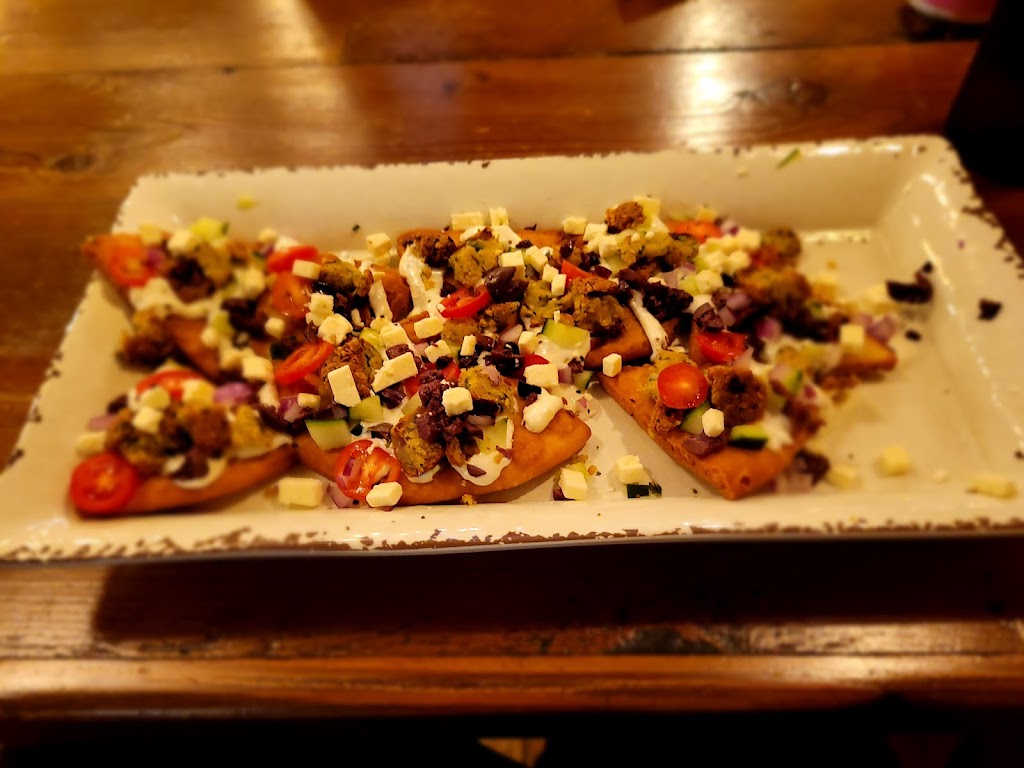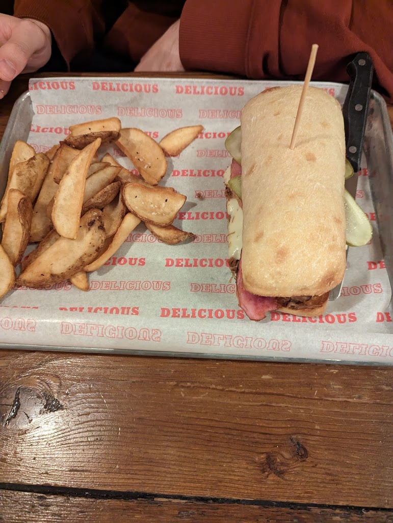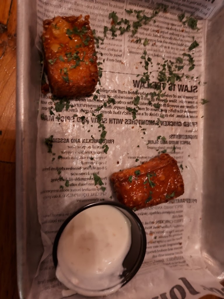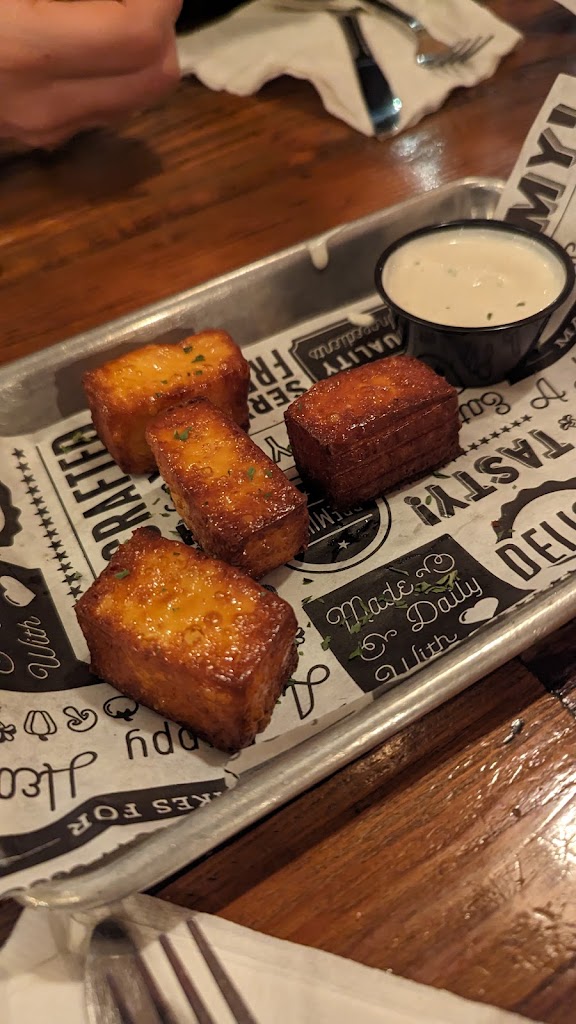Oh boy! Great atmosphere! Some pretty cool metal artwork hanging around on walls of brick. Service was excellent and they were pretty busy. We had the bricks of fried cheese! Also ordered some Reuben wontons. Two of us had the Cubano. One person had a beet salad with shrimp. Everything we ate was excellent and the beer was cold!