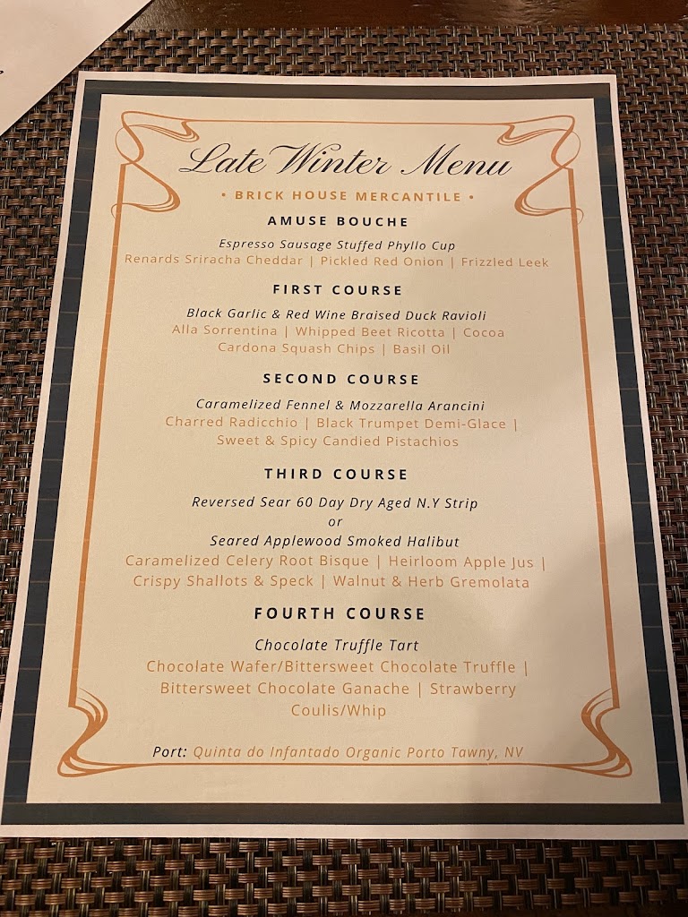 We thoroughly enjoyed the second artisan dinner offered by Brick House Mercantile last week (2/2/22). The food was artfully presented, the flavors were nuanced, balanced and creative, and the portions were perfect for the five-course dinner. Chef Jeremy really knocked it out of the park! The family-style seating and timing of the dishes allowed us to meet and interact with the other guests, and we had a wonderful time chatting with new friends as well as with Penny, Joe and Jeremy. For a fabulous dining experience in a warm, intimate and friendly setting, I HIGHLY recommend reserving a spot at their table!