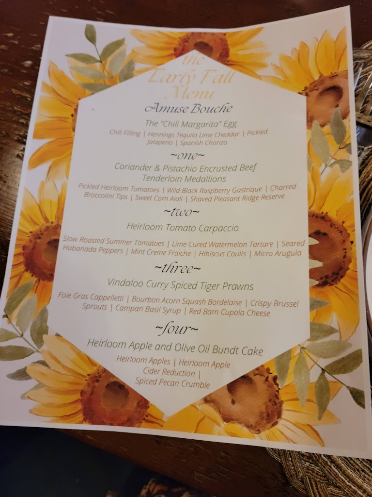 This evening we were treated to the early fall dinner and what a treat it was! There aren't enough adjectives to describe the tastes Jeremy put together - simply amazing. And Joe's dark chocolate tart to finish the evening was perfection. Thank you! We had a wonderful time.