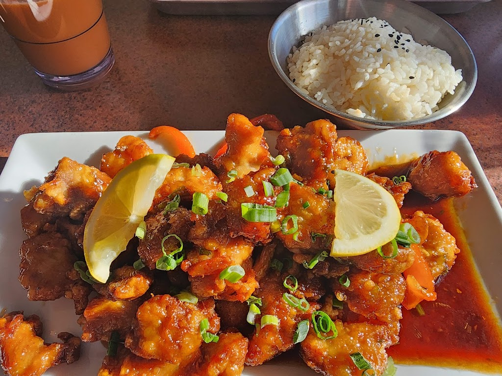 Since I haven't really had Korean food before, I was more worried that I would order something I couldn't eat. I like spicy food but scales can be different across cultures. I eat what our local Mexican restaurants say is #10 when it comes to the spice in my food. But that's jalapenos. I don't know what kind of spice is in Korean food. I landed on a dish that I saw on the Google Maps Menu that was not actually listed on the restaurant's menu. The lady said this could be found in some cases because they are actively updating their menu to suit the crowd as stated above. So I ordered the mandu for a starter knowing I'd be safe with "dumplings" if things didn't go my way. Then I went out on a limb and ordered Spicy Garlic Gangjeong ($17) which was AMAZING! "Boneless fried chicken and shrimp with a spicy sauce sauteed with garlic, scallions, and red bell pepper" that comes with a bowl of white rice (at diner's request) or a bowl of fried rice for a $3 charge. My friend ordered the Bibimbap ($15): "A signature Korean dish served as a bowl of warm rice topped with namul (seasoned vegetables), ground beef, and a fried egg. It was delivered to the table on a tray with a side of kimchi and a small bowl of miso soup. She thought the dish was good but she absolutely LOVED the soup!