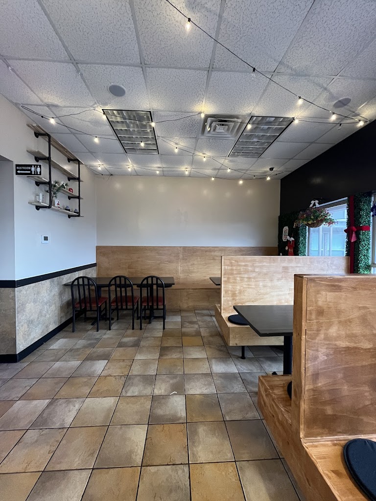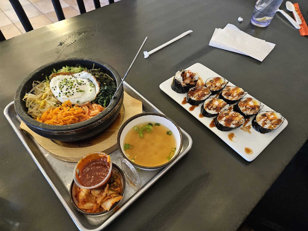 The atmosphere and the room layout was super cute. The pork katsu kimbap had good ingredients, but the pork was very cooked. So it was hard to chew when you got to that point. The bossam was super big and chewy. The greeter was very pleasant and did a great job taking orders. However, one thing that lacked was the service. We received all of our food and still did not receive one of our items. A suggestion that might help in the future is giving customers numbers and call their number when it's done, so the customer knows when their order is done. The second time I went up to ask about my order after 30+ minutes. It was just sitting on the counter. I hope for a better experience from a different location next time.