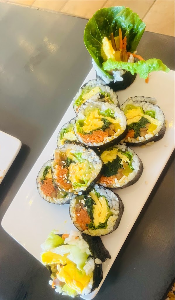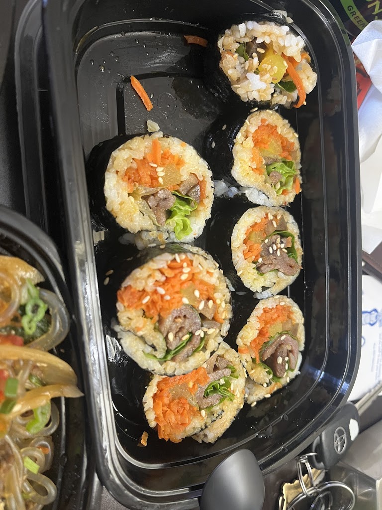 Stopped here on a whim passing through town. We got two kinds of kimbap, tofu gangjeong, and tofu japchae. Everything was very good. The tofu gangjeong had a wonderfully smokiness to it, highly recommend. The japchae could use a little more seasoning, but was still very good. The staff was also very helpful in helping me find vegan friendly options. We’ll be back.