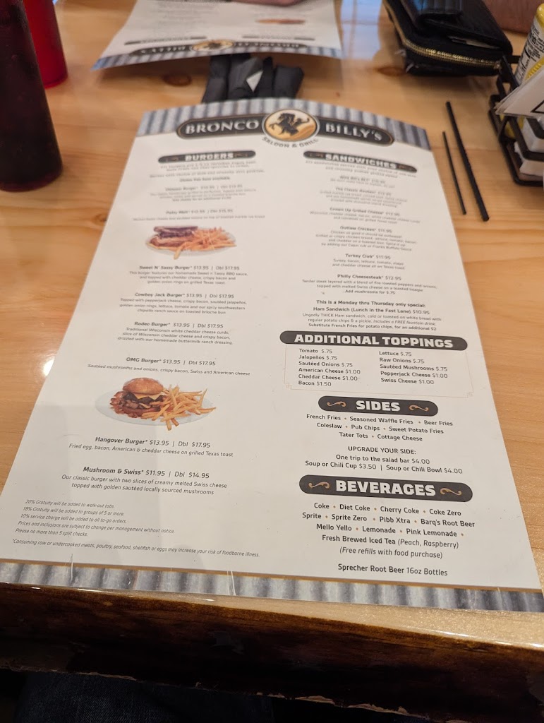 We went to Bronco's on Sept. 11, 2025 to watch the Green Bay Packers play Washington and had eaten there. When we got there the parking lot was full and almost left, but I said no that I wanted to stay. We walked in and I was surprised by how beautiful the newly remodeled saloon looked. We found a table over in the far left corner of the saloon, we sat down and in 5 minutes our waitress came over asked us what we wanted to drink and came back with those drinks, we already knew what we wanted placed our order and in 20 minutes our food arrived and it was delicious, We got to sit in the corner with the biggest TV and watch the game people were so nice there, I want to go back, I also want to say that accommodations were so great, we only drank non alcohol (cherry coke and raspberry ice tea) and we had 3 glasses each. For what we had eaten and drank i only paid 40.66 for our food and the 10.00 tip. I will definitely be going back there this year. If you get a chance please go there and try their food it is delicious and isn't anymore expensive than other restaurants in the area. We were happy with the service and the food. Thank You so much to Bronco Billy's for such a wonderful night. Your newly remodeled establishment is so beautiful we can't watch any football from home and knowing that you do have tvs and show the games makes me so happy, We live 10 minutes from you and are happy to say that you will be our one and only place to come and eat even if we don't make it very much. We won't stop praising your food or the beautiful atmosphere that Bronco provides. I give you 10 Thumbs Up. Barb from Baraboo, Wi.