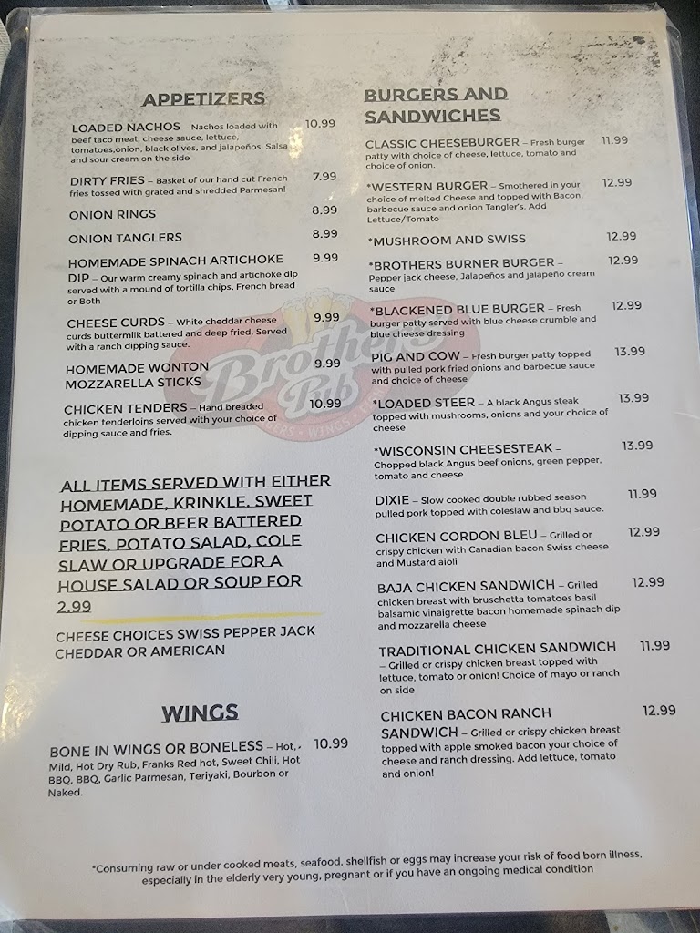 Brothers' Pub is a vibrant bar & grill nestled in the heart of Shawano, WI, serving patrons in the surrounding areas. Established with a passion for good food and great times, this local favorite offers a diverse menu featuring mouthwatering appetizers, succulent wings, juicy burgers, hearty sandwiches, fresh seafood, delicious grilled wraps, wholesome salads, and piping hot pizzas. At Brothers' Pub, we take pride in our exceptional selection of beverages and expertly crafted cocktails to accompany your dining experience. Whether you're looking to unwind after a long day or celebrate a special occasion, our welcoming atmosphere and regular events make every visit memorable. Join us at Brothers' Pub for a taste of hospitality and a fusion of