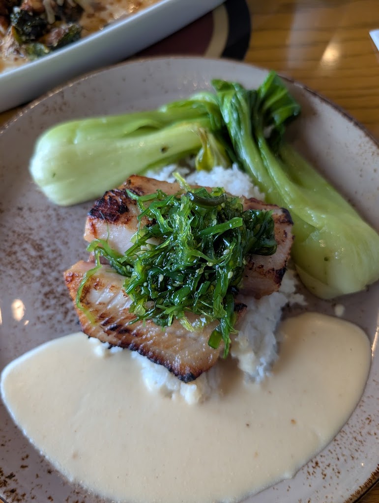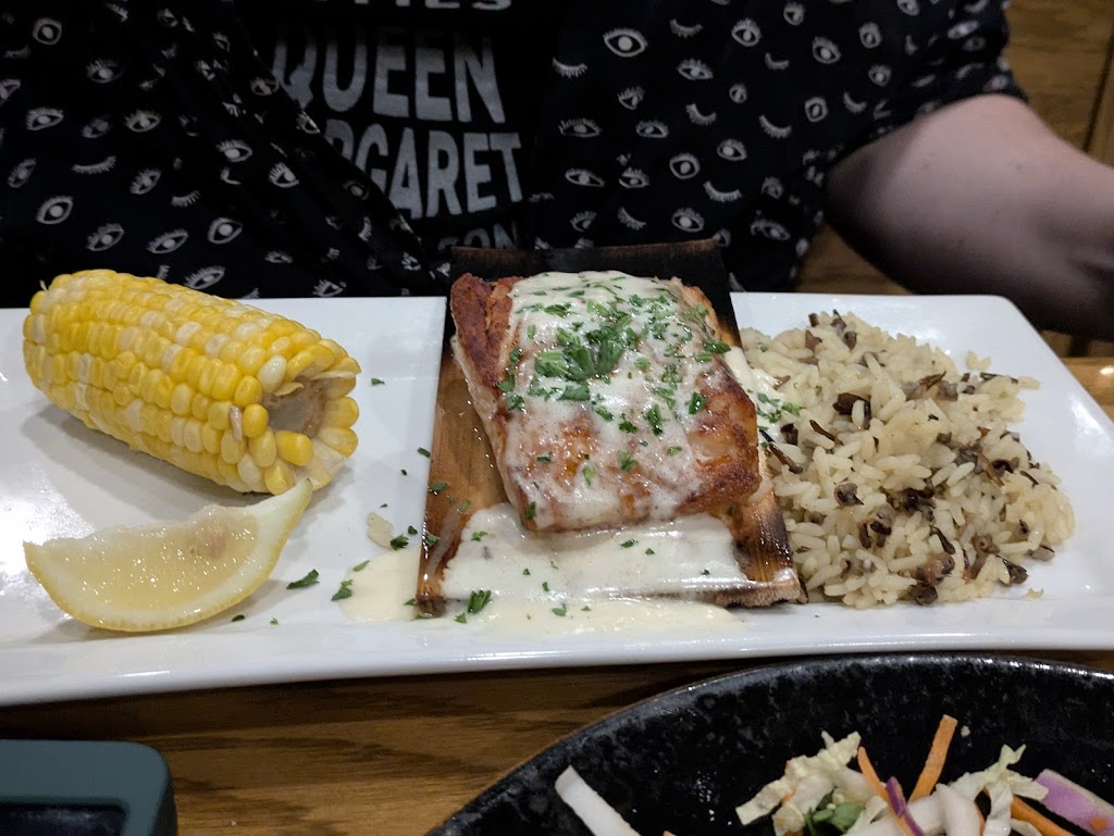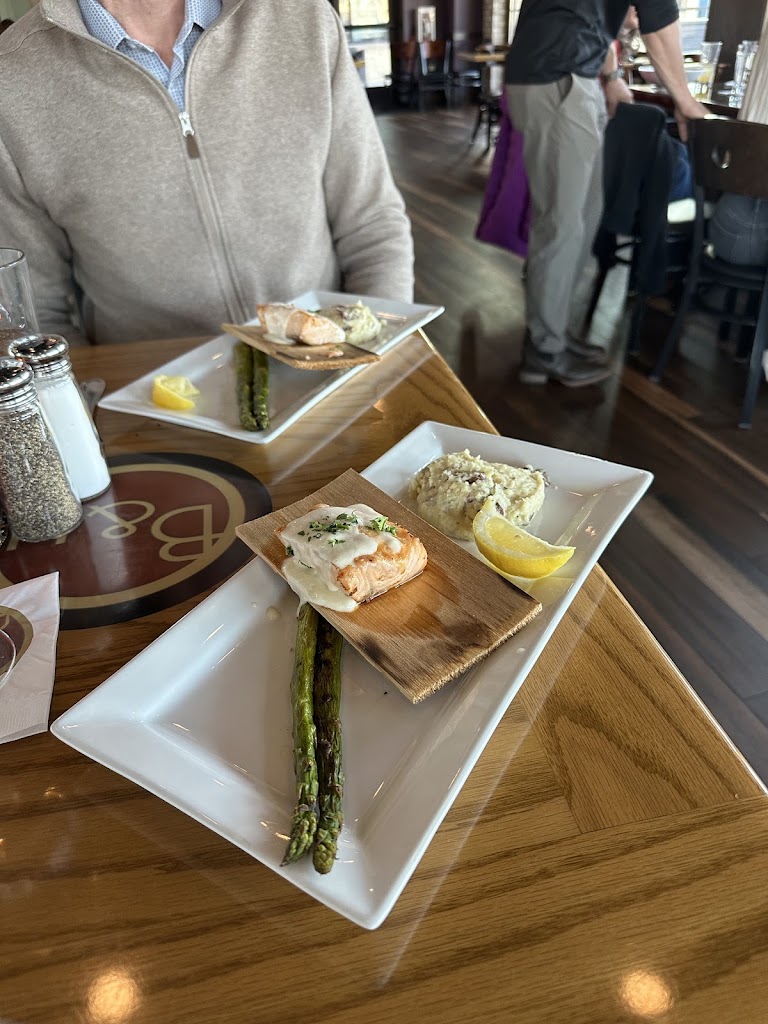Split the cedar plank salmon with asparagus and garlic mash sides. I don’t mind the extra plate charge at all. I don’t like to get too full at a meal (makes me sleepy 🥱). I love that my guy is also a “splitter.”