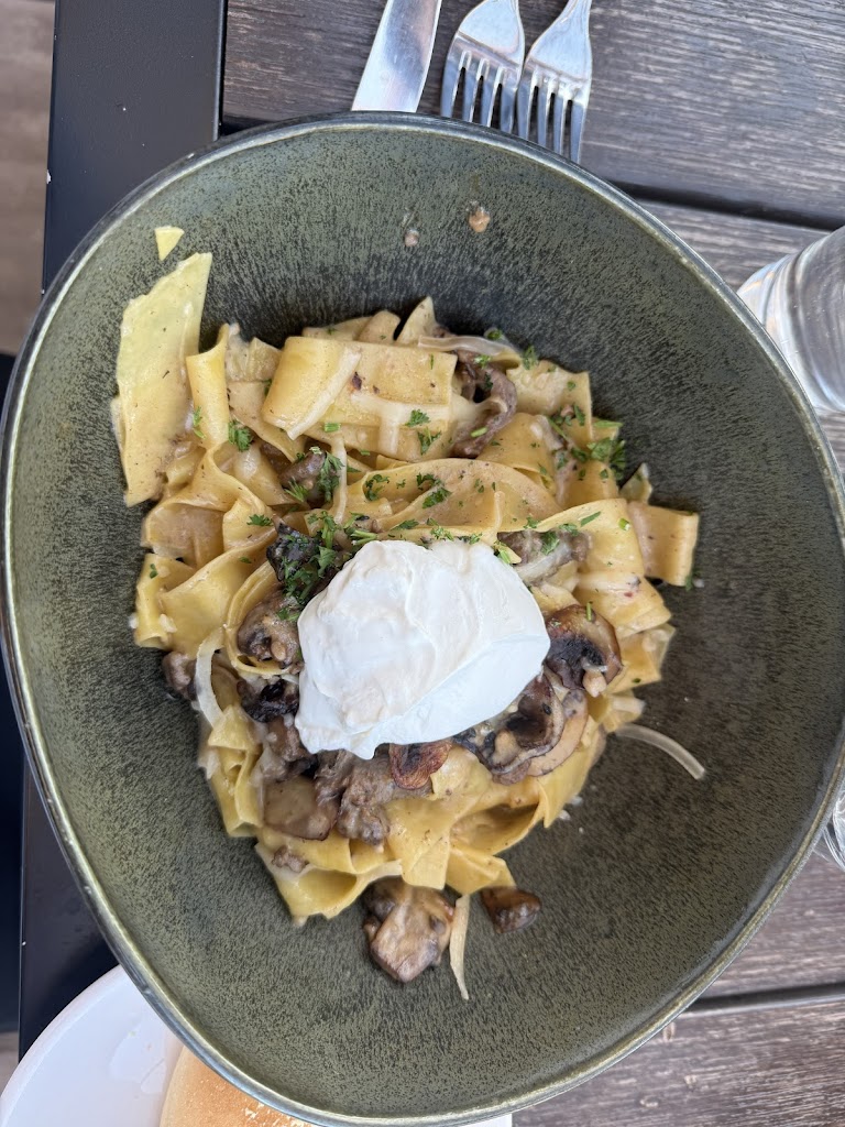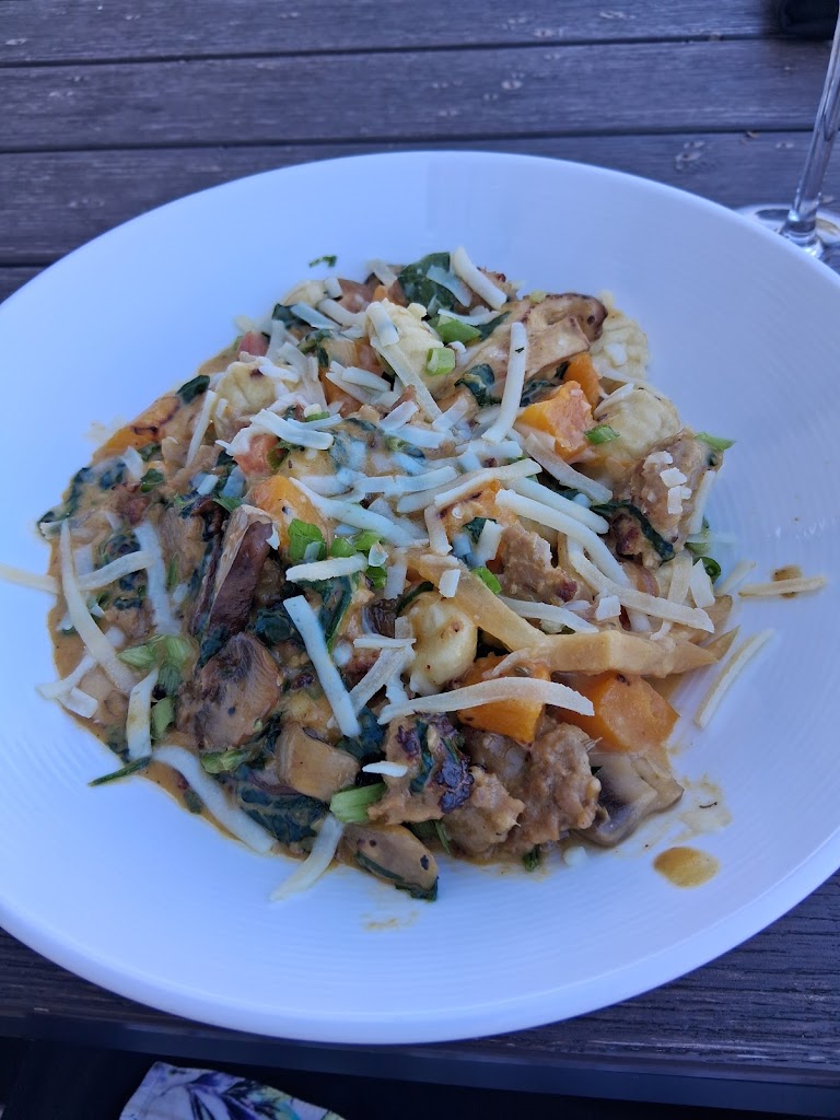First visit local Dane Cty chain. Ordered gnocchi special with It sausage butternut squash mushrooms spinach more. Very hearty. Dish would have been better if squash more heavily caramelized and there was a unifying seasoning. Sun dried tomato? Curry? It was like all the ingredients went to a dance and no one partnered. The staff was friendly and efficient, but as a senior I don't usually wish to be called girl or honey by a youngster. The Monona location is very cool; snag a patio table with water view.