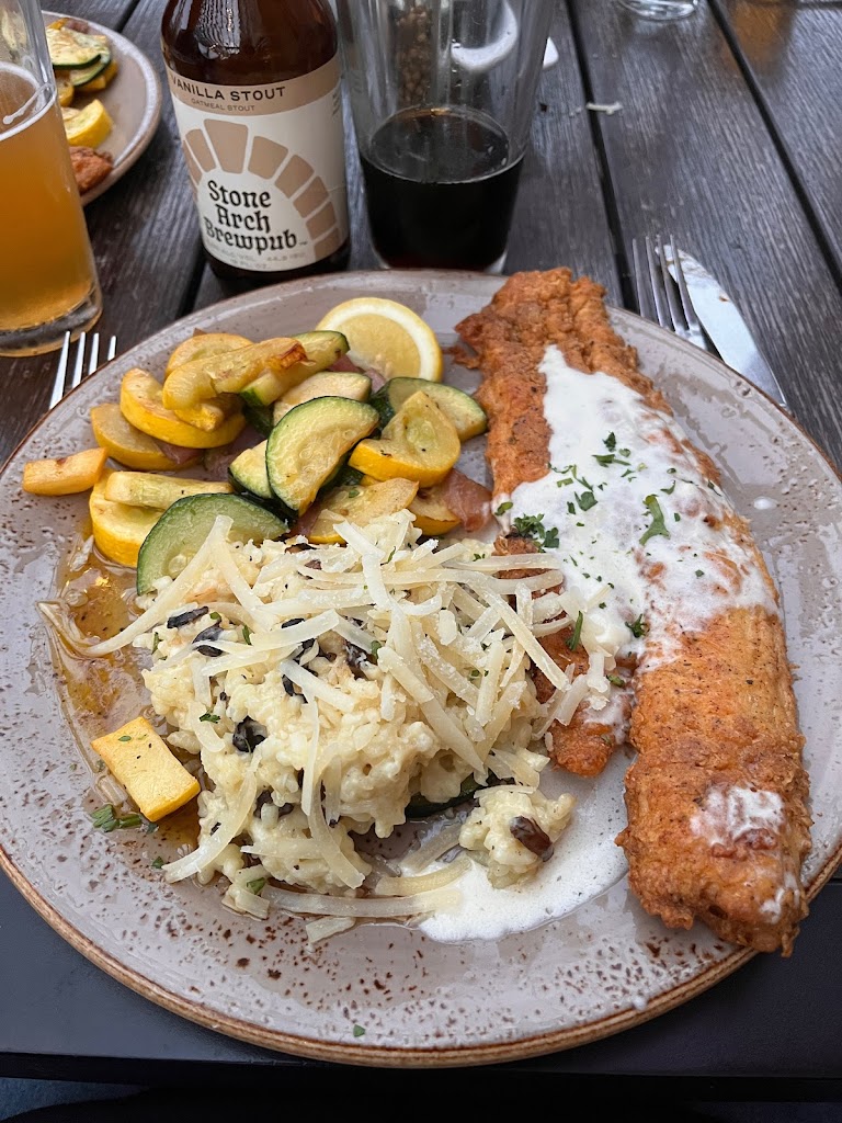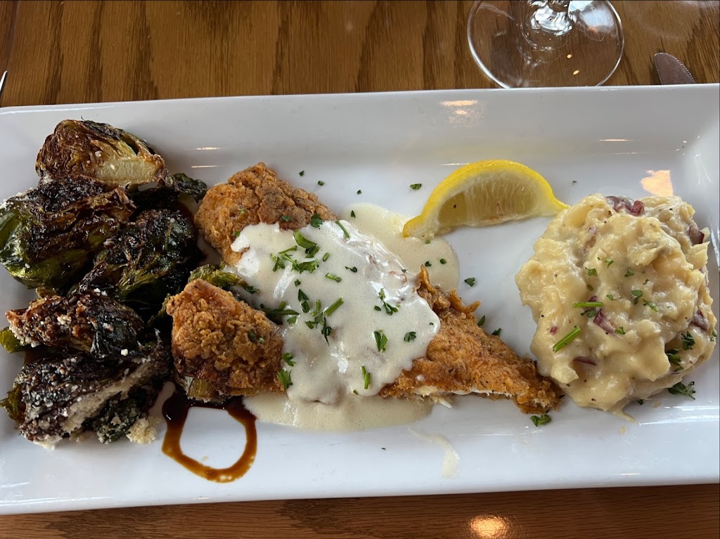Very good food. We always split because there is so much food. We split the walleye with the brussels sprouts. The brussels sprouts are outstanding. This picture is half of the walleye dinner. They split it for us!