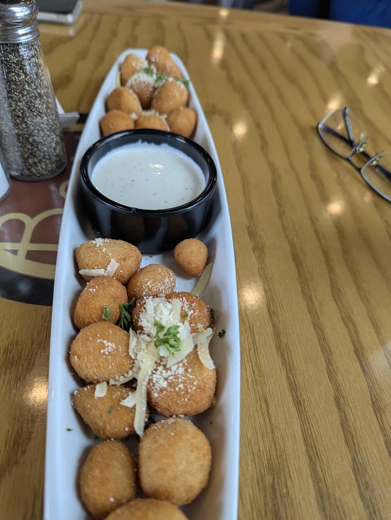 Met up with friends for drinks. They don't sell pitchers. We got 3 sampler appetizers to split. They included a tiny handful of cheese curds, about 5 bam-bam shrimps and 2 bacon wrapped dates stuffed with goat cheese. The shrimp was good, the dates too sweet, and the cheese curds average (they were just plain breaded curds). Service was good, she kept our drinks full but appetizer portions would only realistically serve 2 people. We decided the next time we meet up, it'll be somewhere else.