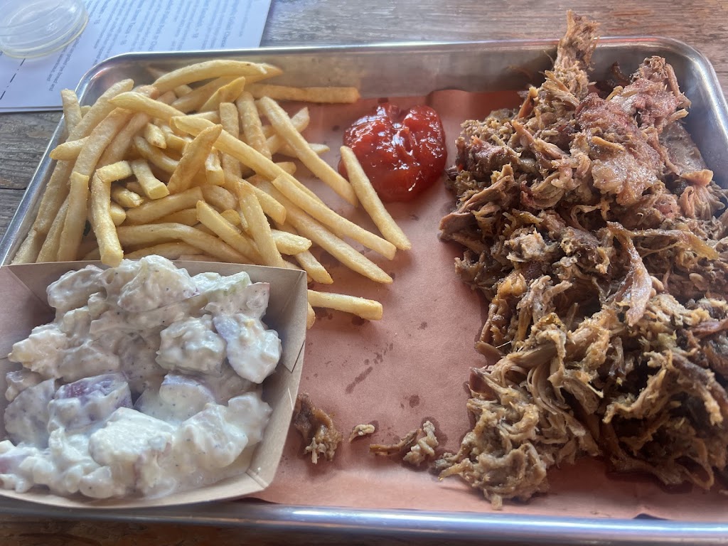 My wife ordered the Pulled Pork with fries and Potato Salad. The Pulled Pork was dry, no flavor - kind of like either sat all day and then was warmed up. The fries - cold. The Potato Salad was average, but nothing special.