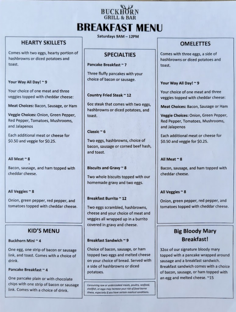 The Buckhorn is a full service restaurant with indoor and outdoor seating. We offer specials daily which is posted on our Facebook account along with our full menu. We have large child playground to keep the kiddos busy while you relax and enjoy your meal.