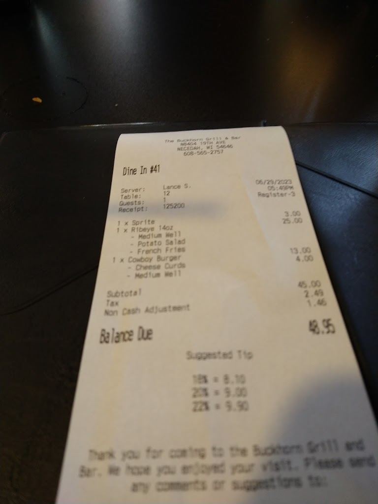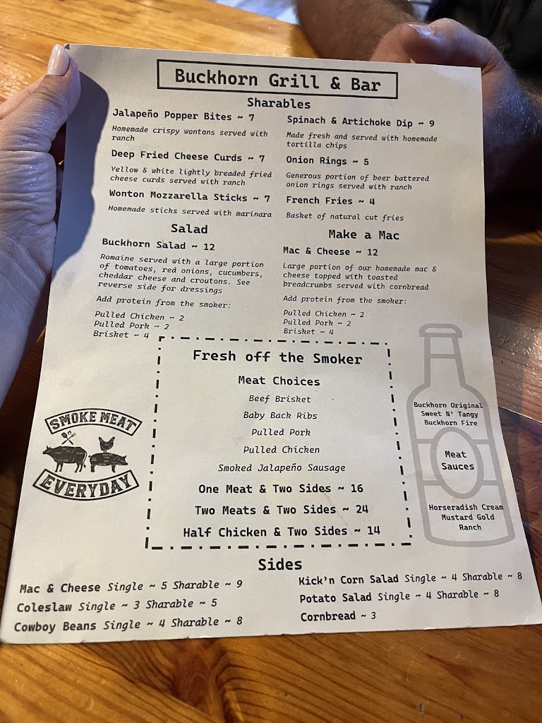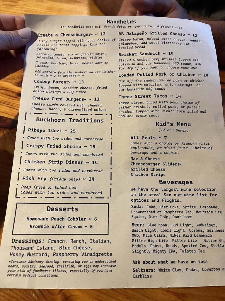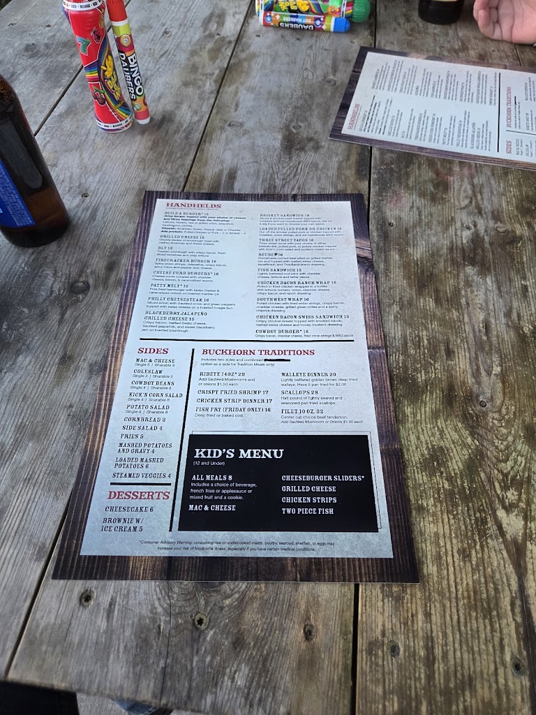 Went there Sunday 6-11 -23 spent $50 on leftover food pulled pork was reheated and dry kickin corn looked like the cowboy beans all brown the and the waitress was hurrying us along. If I wanted leftovers I could have stayed home. No very happy with the the Buckhorn. What happened to this place.