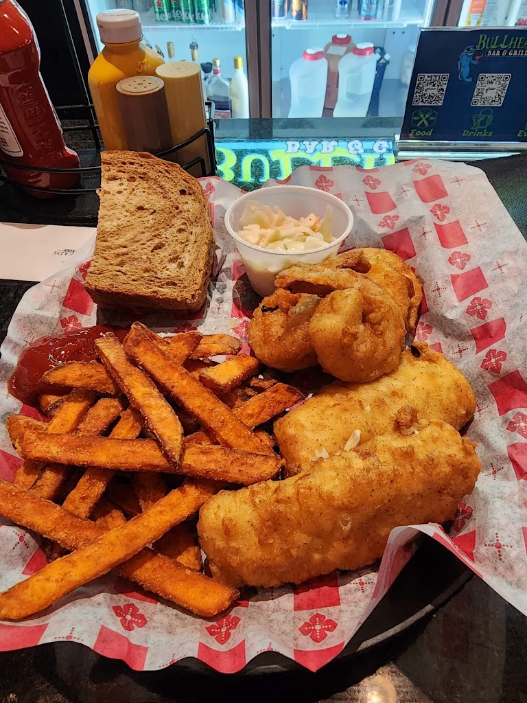 Out for a scenic fall drive and discovered this fantastic place! Huge parking lot! They could handle a good sized crowd here with all the seating areas they offer inside and outside. We were immediately greeted when we walked in the door by Kenny. Being a sunny fall day with temps in the mid-70s, he allowed us to choose a table on the patio where we enjoyed the view next to the Wisconsin River. Kenny recommended their specialty Broasted Chicken dinner. They even offer the option of choosing all white meat! It came with coleslaw, dinner roll and choice of potato. It was delicious!! Also ordered the chicken bacon ranch wrap with sweet potato fries....YUMMY! Kenny kept the cold drinks coming and checked on us often. We loved the inside decor, especially the old motors mounted above the big screen TVs! Lots of seating both inside and outside. Along with patio seating, they have a HUGE covered deck area with lots of tables and a nice screened-in outdoor bar! Couldn't have picked a better place than Bullheads. So relaxing and enjoyable! They even have an axe throwing caged area! If you're looking for a fun place that's perfect for families, couples or groups, we highly recommend this excellent bar and grill! Be sure to say hi to Kenny.... he's the best! This will be on our FAVORITES list. Can't wait to return!
