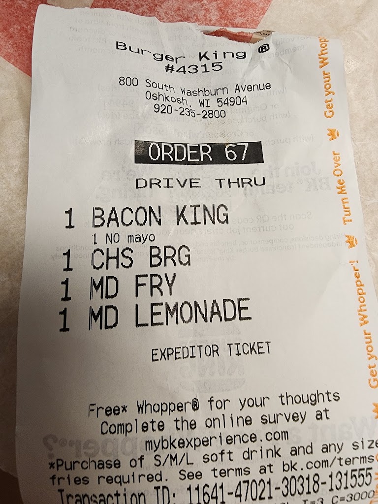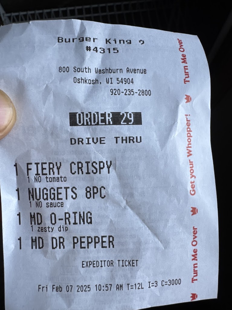 Usually when I go to a Burger King in Oshkosh it isn’t my first choice. This one is always my choice over the other one though. I can’t say I’ve ever had a bad experience or bad food. I have had times where it could have been better, but nothing that warranted a complaint. However this last Thursday these guys amazed me all around. My semi broke down for the second time that day. It died pulling in to the lot there and I had to wait for a wrecker. So I thought why not. I’ll go grab dinner while I wait. I got to the door to see the inside was closed due to staffing. I walked back to my truck frustrated. But then I had an idea. I downloaded the mobile app and put together my order. Then I called the store and asked if I submitted it if they would just meet me at the door with it. They said absolutely! So I did and walked back to the door. They didn’t meet me at the door. They let me in to wait. My food came to me super hot and just made. They could have easily and politely said no and it wouldn’t have been any fault of their own and I would have understood. But they didn’t. I wish more places took drivers in to consideration in situations like this. A huge thank you to you guys!!!