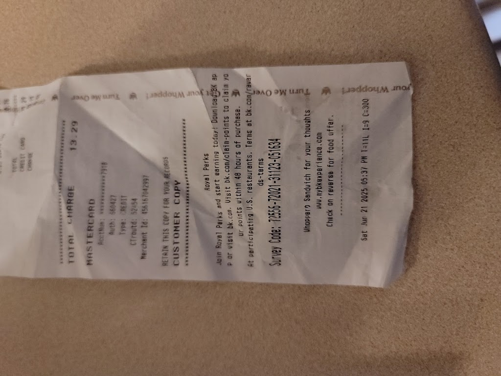 Horrible service , no napkins or ketchup ,the employees were horsing around, the burger didn’t look like no whopper ,very messy and barely anything in it ,fries were cold and no salt, over all ,the cooks need lots improvement and training