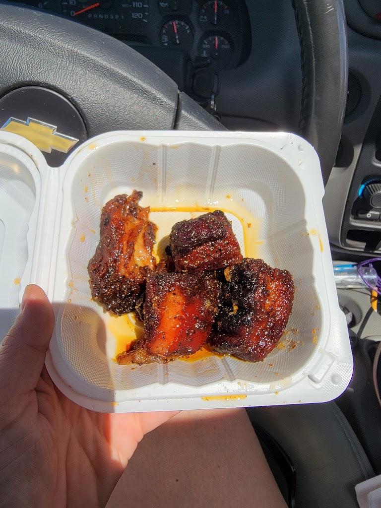Sept.5 noon lunch. Chicken wings with white sauce on side. Rub is exceptional, wings good size. Occasionally dropped in white sauce and that picked up flavor another step. Fast service.