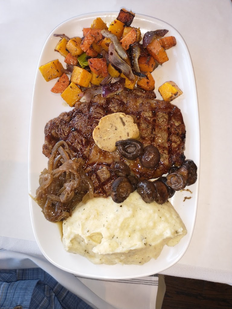 We were greeted by Juan for our 5:00pm dinner reservation and immediately seated. This restaurant uses the YELP! app for making and cancelling reservations. Juan promptly left us with menus and took our drink orders. We both ordered the beet salad and boneless ribeye. The salad was delicious but as Juan warned us one salad could have fed the two of us. But that's okay, we'll eat the leftovers tomorrow! My wife ordered her ribeye (medium) with the mashed cauliflower. She loved both. I ordered my ribeye (medium) with garlic mashed potatoes. Both steaks had a perfect sear, were very juicy, tender and done to perfection. At 14 ounces each, there was plenty to take home. The side vegetables, a squash, onion and sweet potato medley were spiced just enough for me a bit much for my wife. We were in at 5:00pm, enjoyed a great meal. Had excellent service and left around 6:00pm.