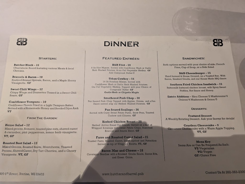 Fine dining in a modern Pub. High quality seasonal ingredients prepared from scratch including prime steaks, fresh seafood and delicious comfort food items. An excellent selection of craft beers, select wines, and hand crafted cocktails to accompany your meal. Butcher & Barrel brings fantastic food, drink and high quality service - without the stuffy fine-dining experience. A restored 120 year old building located in the heart of downtown Racine, just blocks from Lake Michigan.