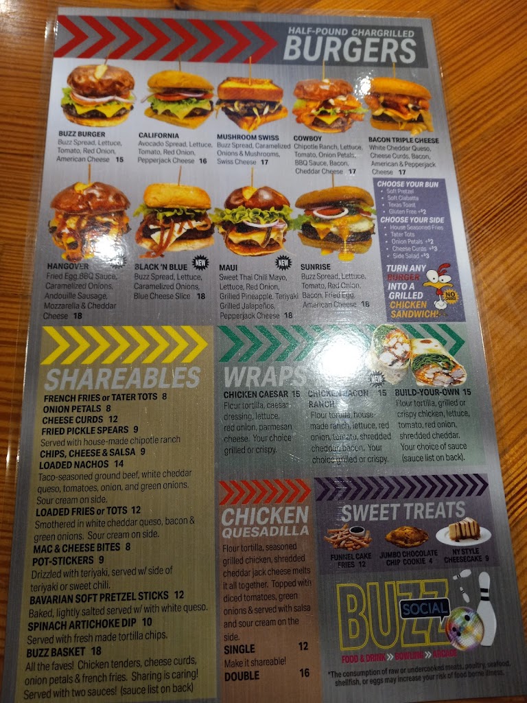 Buzz Social is the best bowling alley we have ever been to! The moment we walked in the door we were greeted by one of the owners who made us feel very welcomed. Impeccably clean, beautiful lanes, delicious food, attentive and friendly staff, great music, a beautiful bar, and a cozy sitting area with a fireplace! These guys have thought of everything and there is something for everyone! We didn’t visit the arcade but it looked fun! $12 per person for 2 hours of bowling, including shoes. That’s a great deal! This is our go to place from now on!