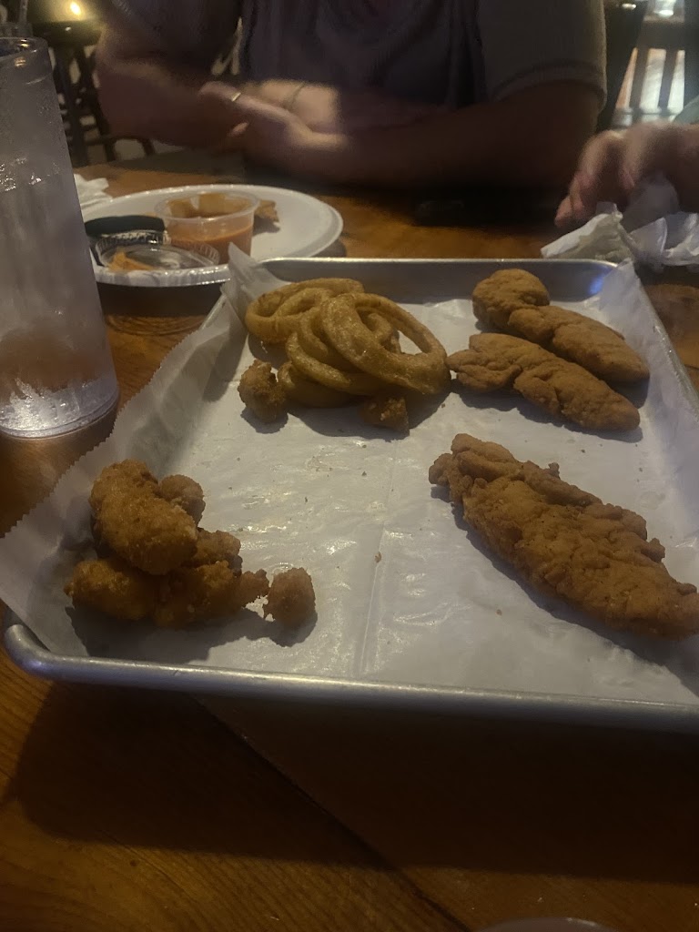 They brought out the food fairly quickly, it was okay. Overpriced for what it was. We got a few wraps and the appetizer platter (pictured half eaten). While in the middle of eating our food, the lights in the dining area turned off. After a few minutes our waitress was kind enough to ask if we wanted the lights turned back on. Overall, I dont think I would come back for food but the bar area did look pretty popular and a good atmosphere there.