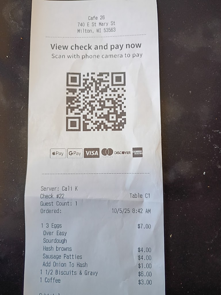 Stopped into Cafe26 in Milton looking for a new breakfast spot near my lake house. The staff was great..., very friendly, attentive, and on top of things. The place itself looks nice and inviting, and the menu at first glance seemed solid.