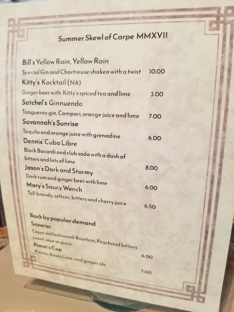 An evening at the Cafe Carpe (tavern/music venue) is like going home - that is if your parents are culinary masters of American fare. Serving savory homemade sandwiches, salads and specialties along with rich pies and tortes that could only have been created with loving care using only the finest of fresh ingredients. With the help of their friends playing music and serving drinks, you will always be entertained and greeted with a warm smile and a cheery hello from your hosts Bill and Kitty.