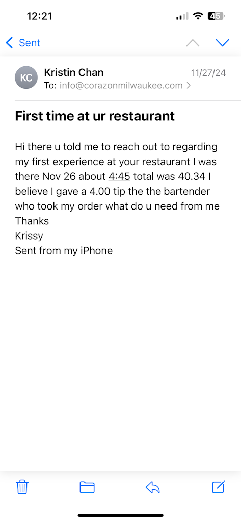 Food is always just Ok, need more variety, options get bland and outdated. Also never seasoned enough, really bland lately. I’ve been going to Corazon for years throughout different properties they have had and this one in particular has been a favorite of mine until recent. Staff is always engaging from host to bartenders to servers. The issue lies with management, or should I say new management. I’ve been going to this location through various changes in management from Kayle and Marco (sorry if that’s wrong) this new lady who I have yet to learn her name seems like she has really rocked the boat, she doesn’t have the guest presence that previous management has had, I could always look past the food issue because my wife loves this place and the management at the time made up for it with their hospitality. We went in about 2 or so weeks ago looking to meet the new manager and was informed she had been off property to take her child to get a haircut, at that point as we were informed it had been about 3 hours, we stayed for about an hour without sight of her. I assumed she had taken the day off, but as we were getting ready to leave she appears, without even the. Chance to introduce ourselves she was already in her car leaving again. Seems like staff is frustrated at this new “manager”. We have been in multiple times since and have seen her outside smoking cigarettes on the phone more times than she’s actually in the restaurant even when we have observed the restaurant to be very busy. Not sure who is in charge of hiring this level of employee but maybe that person needs to be retrained in reading a person before offering them a position within a busy restaurant. To this day, we still have no idea what her name is.