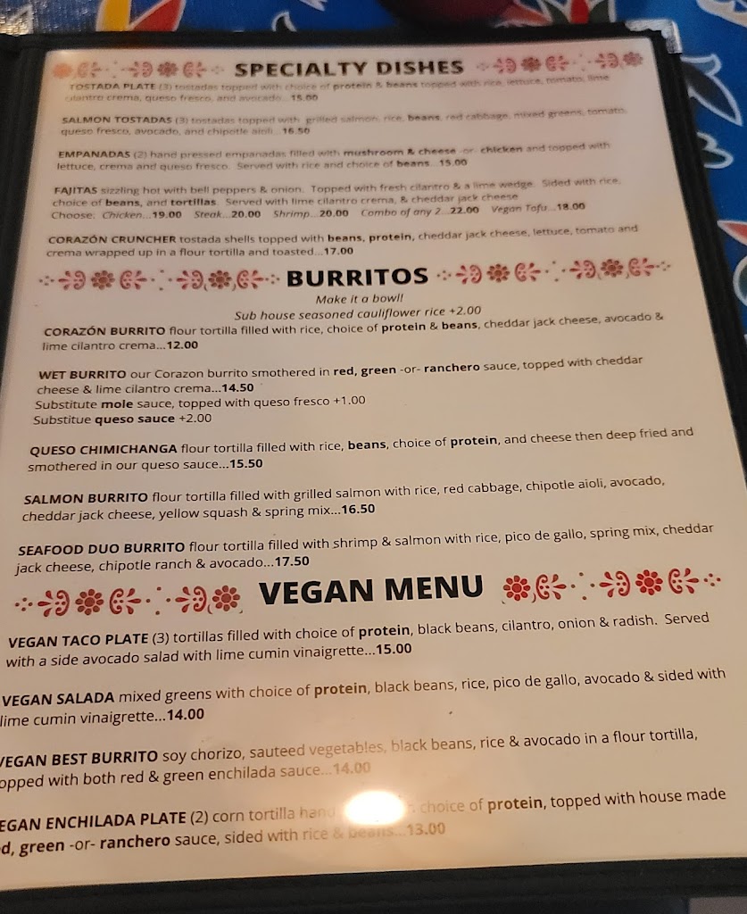 I love Corazon. My fave is anything with their mole. The queso and chips are enough to make you come back over and over again. The patio and outdoor eating areas are delightful on a warm summer evening. For me, the only downside is that I think the prices are higher than they should be. I'd go there much more frequently if they were lower, but maybe it's a good thing for my waistline. 😆