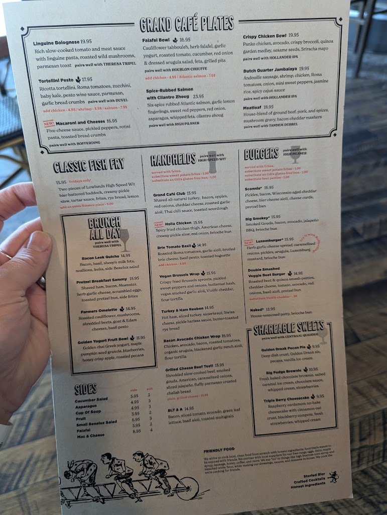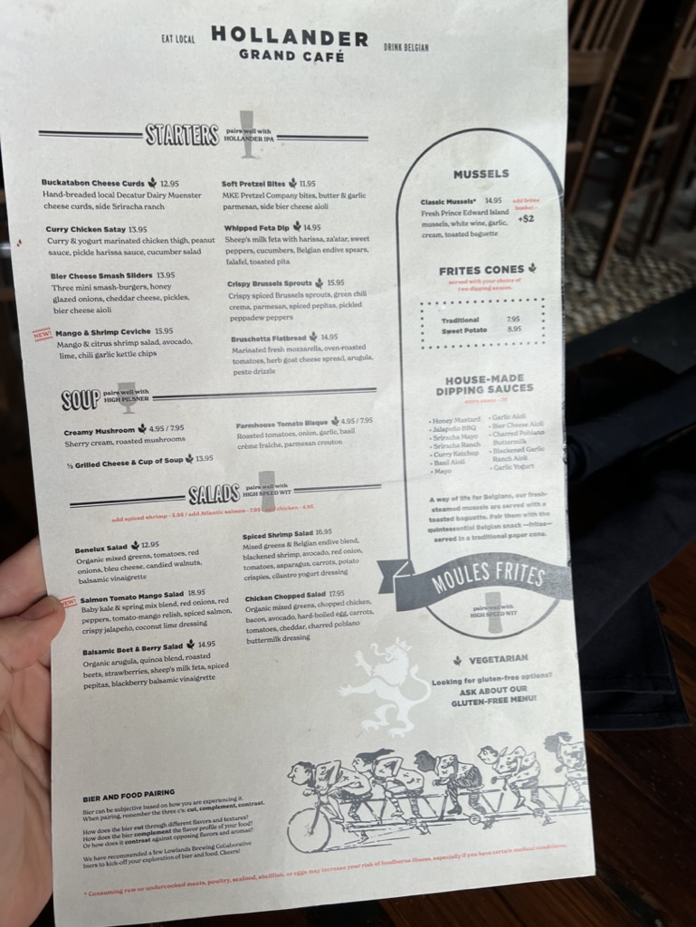 Hi like Cafe Hollander. First time to this location. I find their food and beverages to be good and consistent. I now have a favorite dinner meal. I enjoy a couple of appetizer selection. The brussel sprouts and the Currey Peanut Satay. Great textures and flavors.