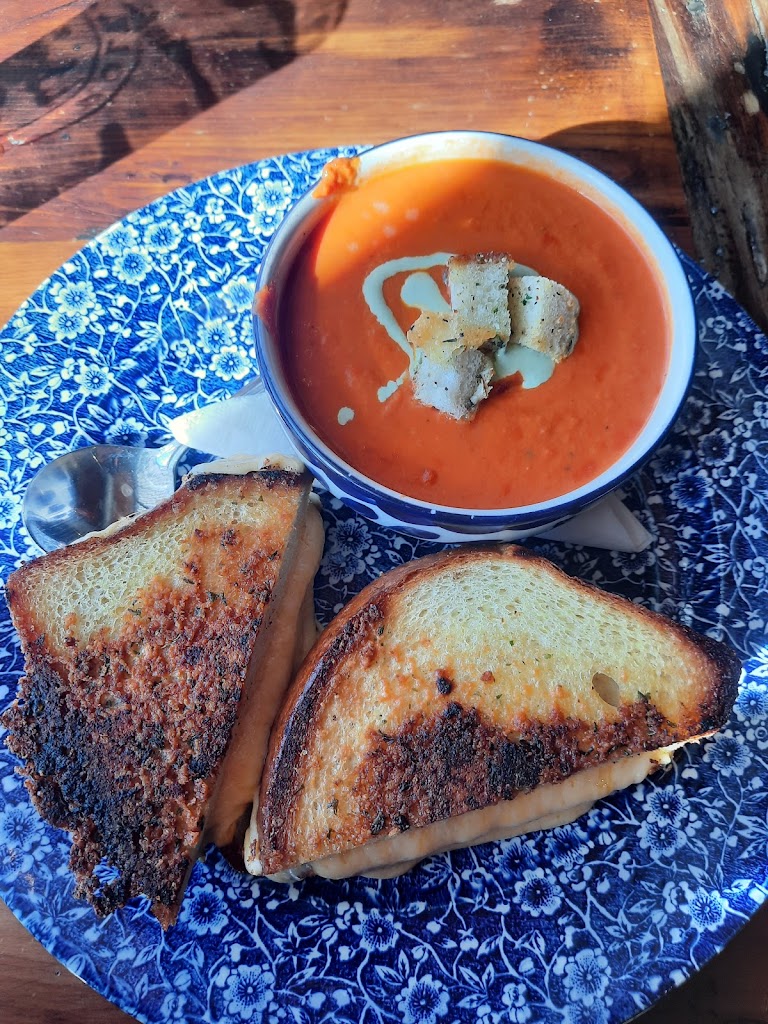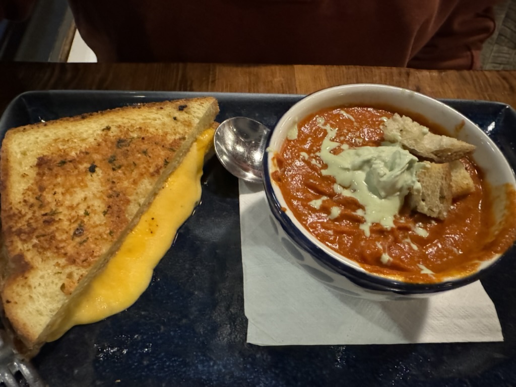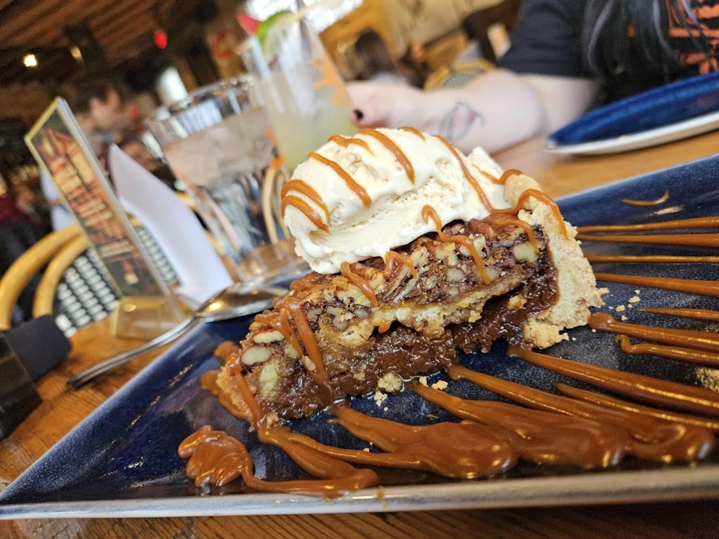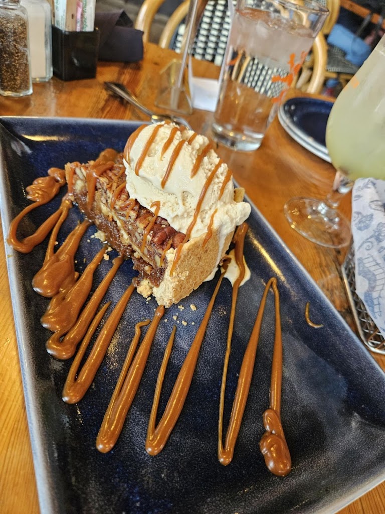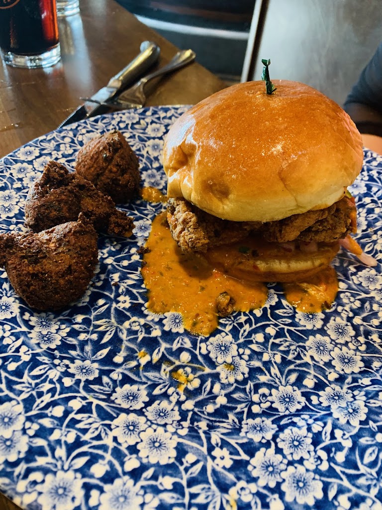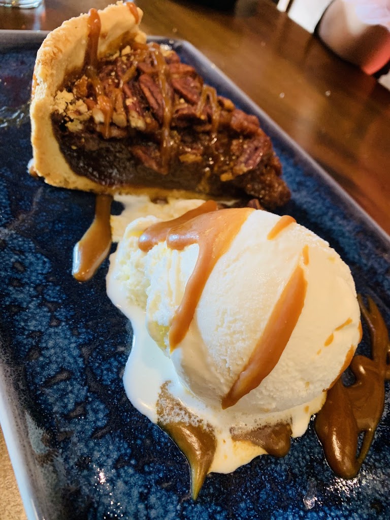 Loved the food here. Visited on a sunday evening-the place was not too crowded. We really liked the cream of mushroom soup with pesto mozzarella flat bread. The sconei burger is just amazing. The red hot sandwich has a spicy sauce. They substituted the falafel instead of fries for 2$. For dessert we tried the pecan pie with ice cream which was just so tasty. Our total bill was close to 70$. The service was perfect. Highly recommend this place if in the area.