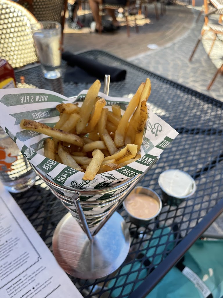 Great ambiance. Wonderful outdoor patio space. The food and drinks were good but over priced. A drink, sandwich with fries and split with a friend appetizer was $50. It wasn't that special. Service didn't do anything wrong but we're just adequate.