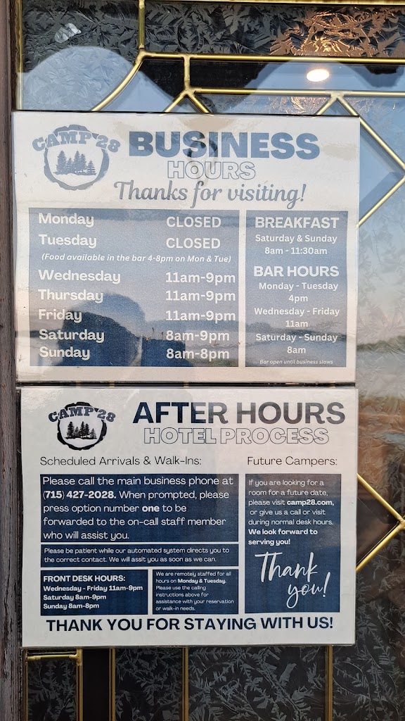 Camp 28 has been redone, and is far better than when I was last there a few years ago. We stopped in on a quiet Thursday afternoon, and I had what might have been the best pot roast I've ever had at a restaurant. The walleye was also outstanding, and there was an excellent selection of beers, with several local ones on tap. Highly recommended.