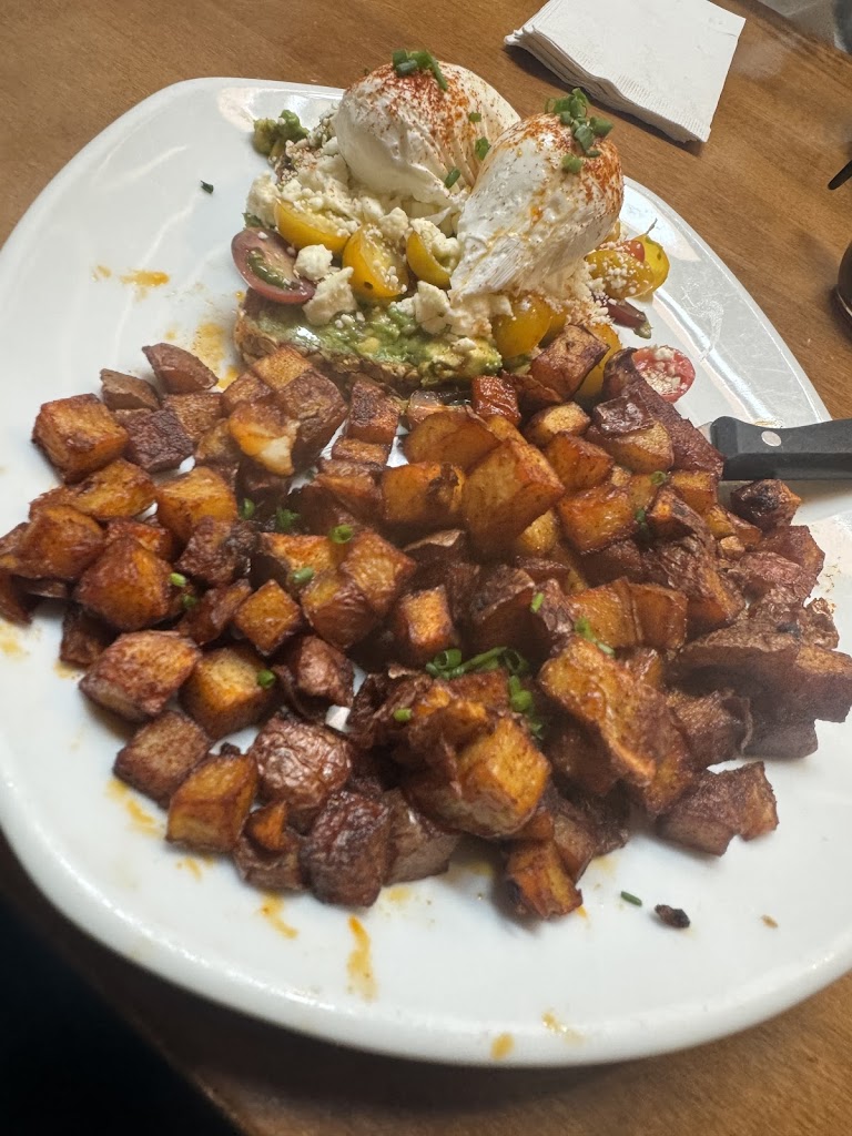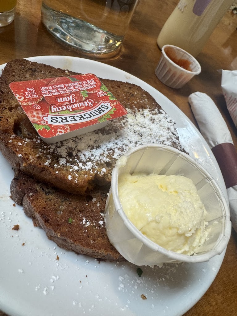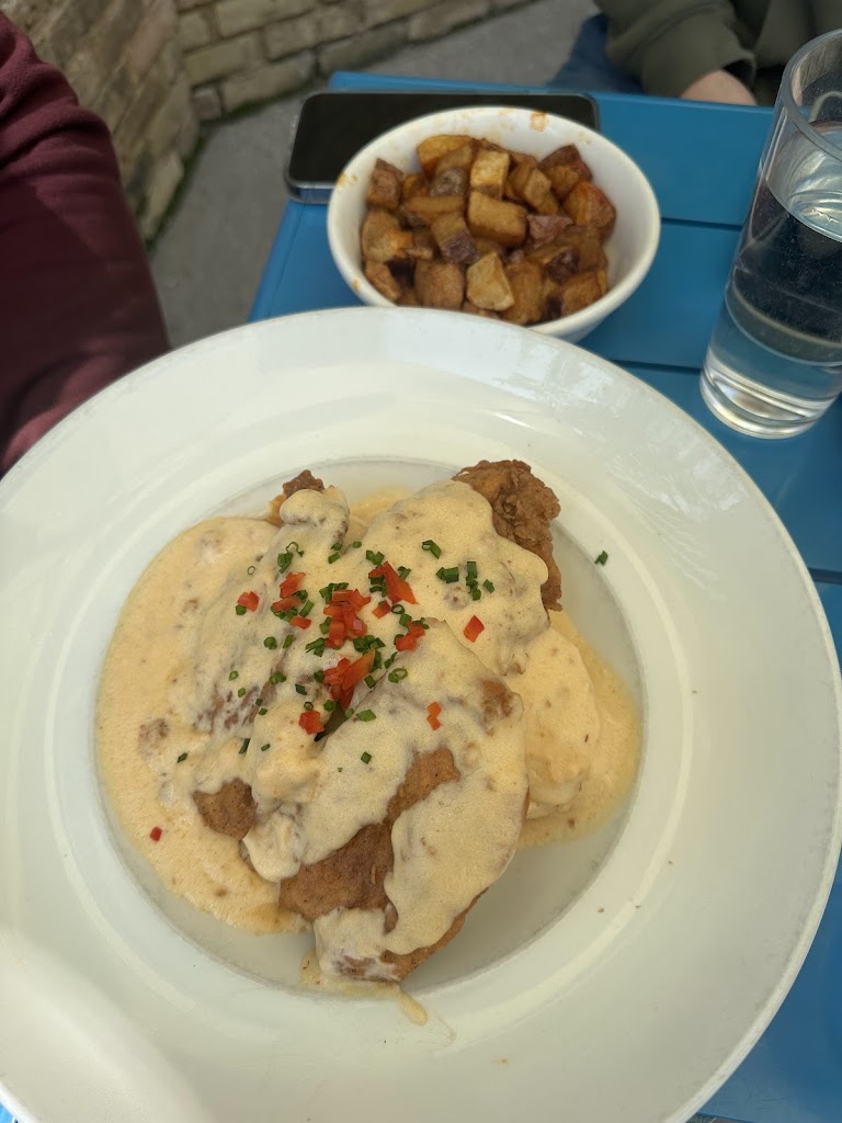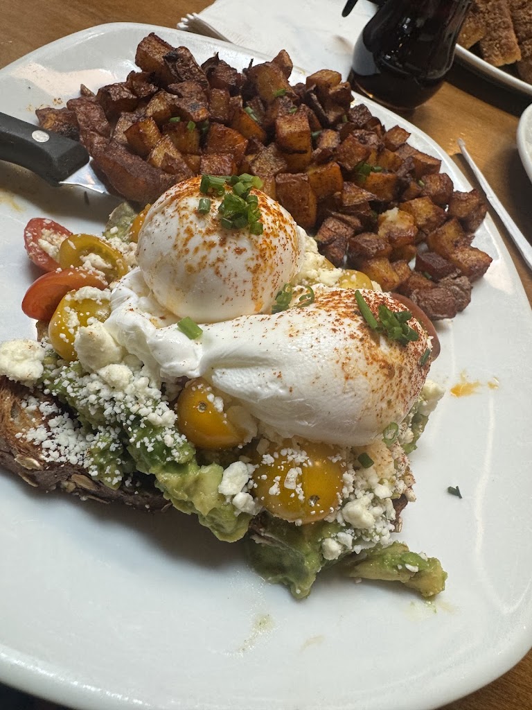 So we ordered the chicken and biscuits, French toast, banana bread, pancakes and avocado toast. The chicken and biscuits with the gravy was really filling, damn near will put you in a coma at the table. The avocado toast, was very jam packed. The two poached eggs, the heirloom tomatoes, feta cheese and chunky avocado was heavy. One egg would’ve been good enough, and maybe if the tomatoes were cut a little smaller it would’ve been better. The bread could hardly hold all the weight and moisture. The pancakes were unfortunately dry. The banana bread was good can’t go wrong with some good banana bread. Overall I probably wouldn’t go back…I can say the atmosphere and service made up for everything else.