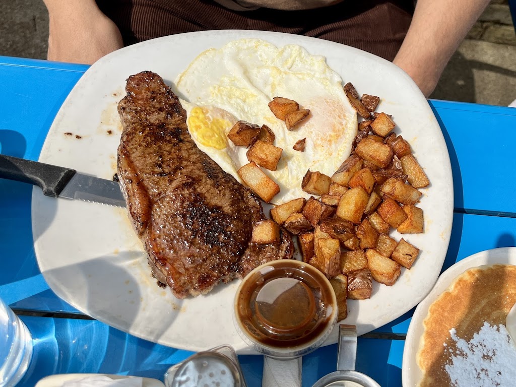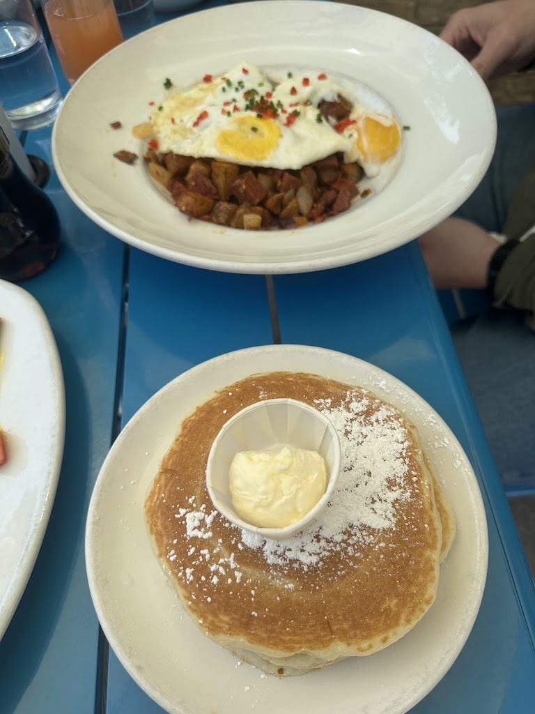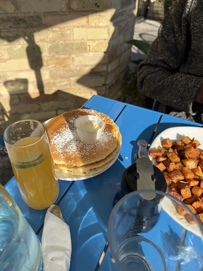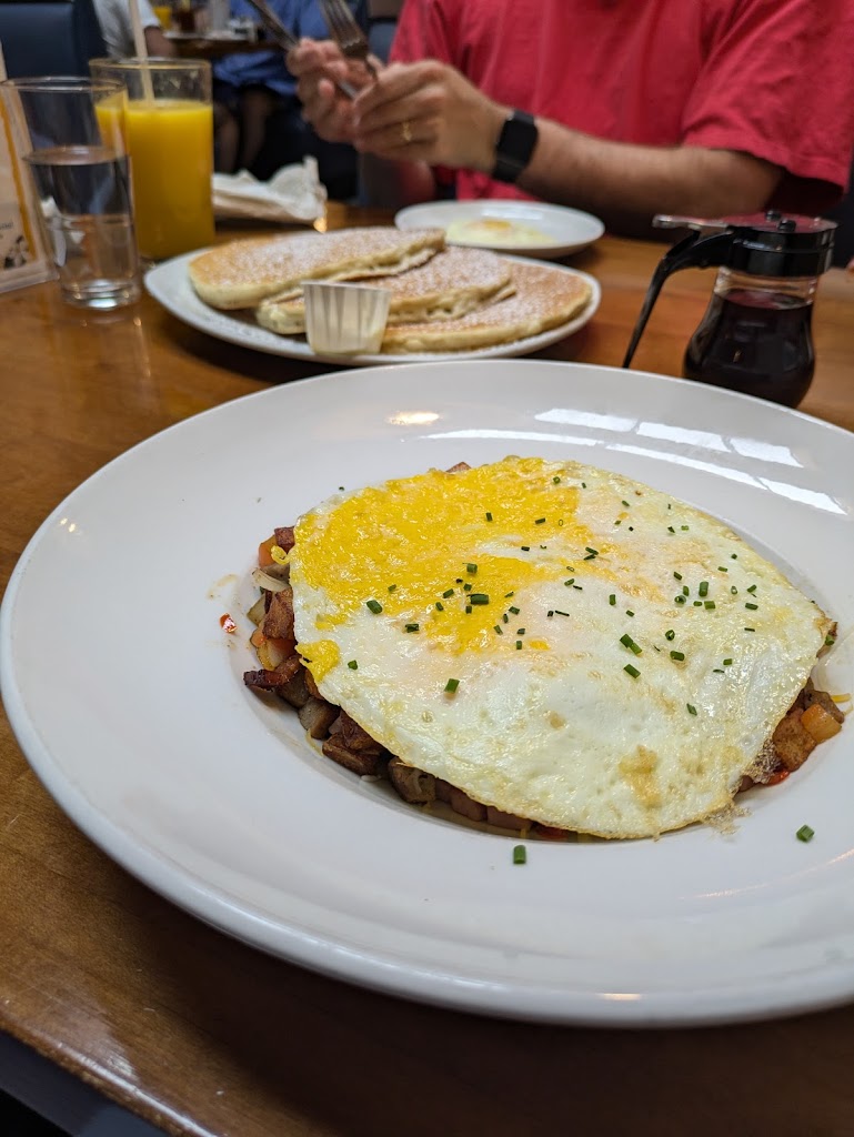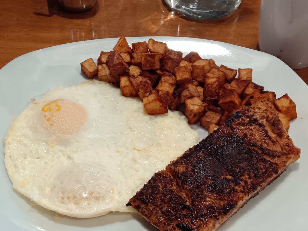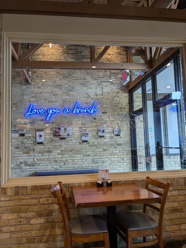 We come here every time we’re in Milwaukee for brunch. Doesn’t disappoint. We always get pancakes without powdered sugar. I’ve tried so many of their items it’s hard to remember them all. Most recently I had the three amigos. It was delicious and filing. Be careful with the salmon Benedict. It really is a piece of salmon (not lox lol ) but it was a little dry for my taste. The coffee is good. Mimosas are 2 for one on Tuesdays.