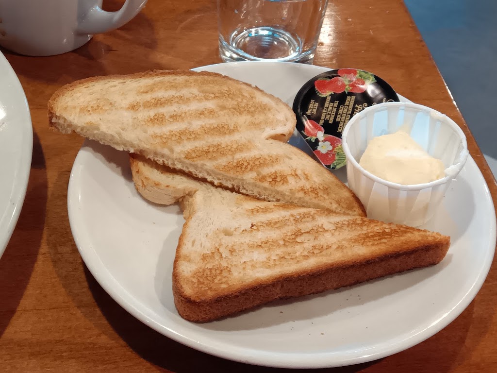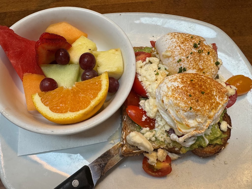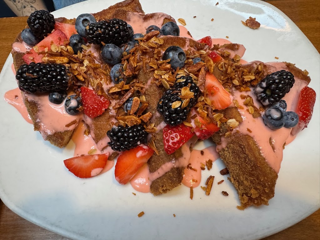We got a booth and were immediately greeted by our server. We ordered our drinks (latte and hot tea) and then quickly followed up with our food: Very Berry French Toast and Avocado Toast (with poached eggs). It didn’t take long for the food to arrive. Everything was the right temperature, very flavorful, well presented, and good portions. The French toast had excellent textures (coated with Cinnamon Toast Crunch), and the poached eggs were perfectly cooked. I also liked the feta cheese on the avocado.