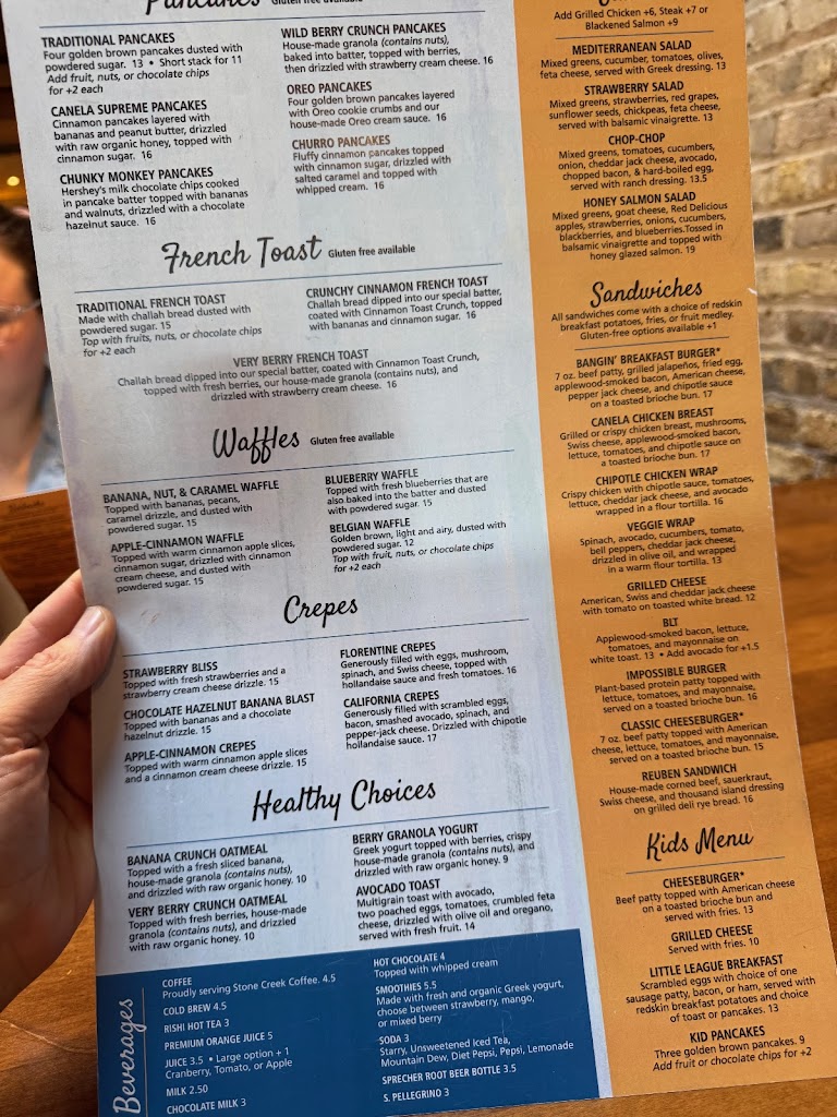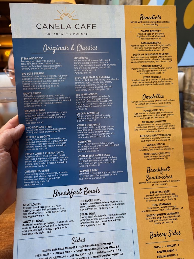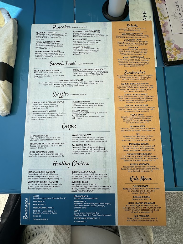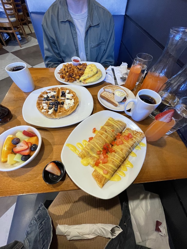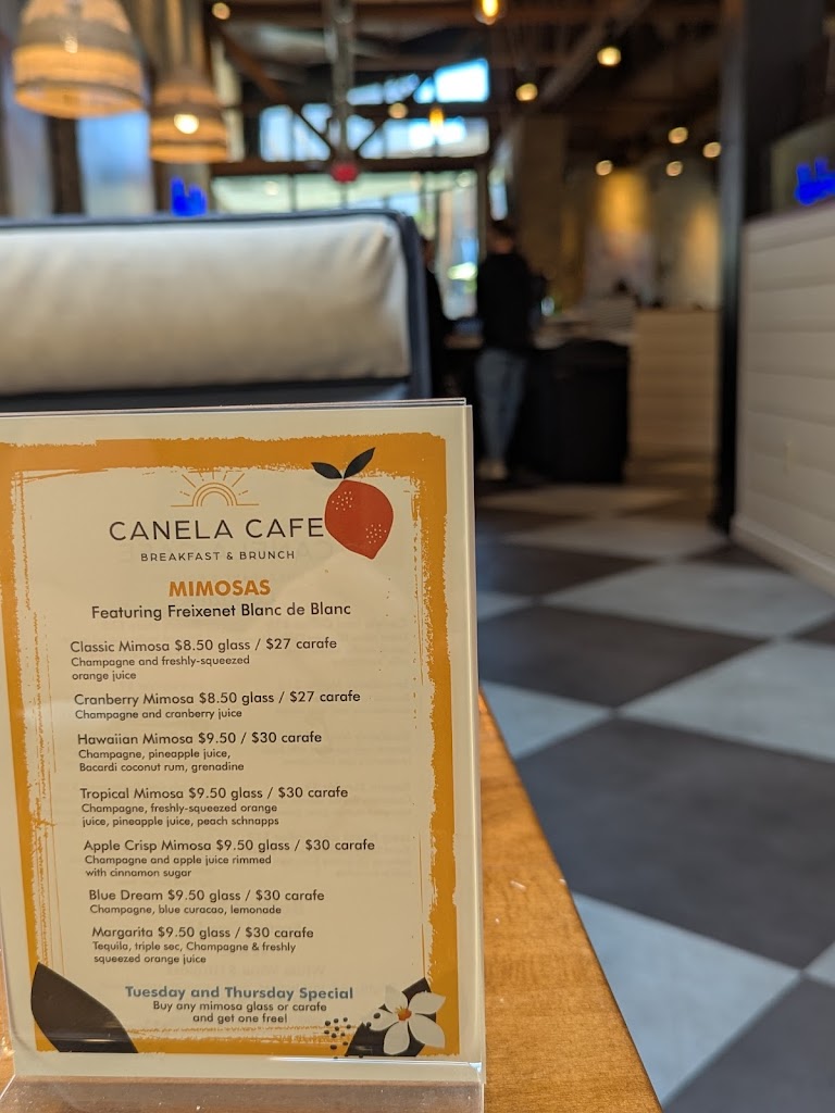Canela always hits. It is a favorite brunch place. The blueberry waffles were so delicious. I got a savory crepe because I was feeling adventurous and I really enjoyed it! Mimosas were delicious and my husband enjoyed his omelette.