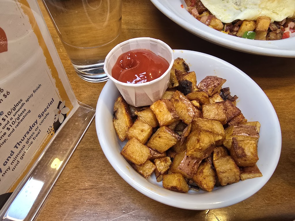 The manager came out to talk to us. She acknowledged that the potatoes looked bad, but insisted the potatoes were always cooked fresh to order. Just looking at the potatoes they were obviously precooked early this morning and then they throw it on the grill for 30 seconds. The manager and the server clearly have no idea how the food is prepared in their kitchen. Towards the end of the meal the manager brought out brand new potatoes, that we didn't ask for, and they were severely undercooked and raw in the middle. The cook AND the manager didn't even taste them to make sure they were perfect before serving them. Quality checks are a simple yet crucial step especially if it's a remake. At the end when we got the bill, they charged me $3 for my toast! I didn't even say anything I just paid and left knowing I will never come back to this place, it's so sad. Going out to breakfast is supposed to be a relaxing experience, and this was stressful for us. I could have made a much better breakfast at home.