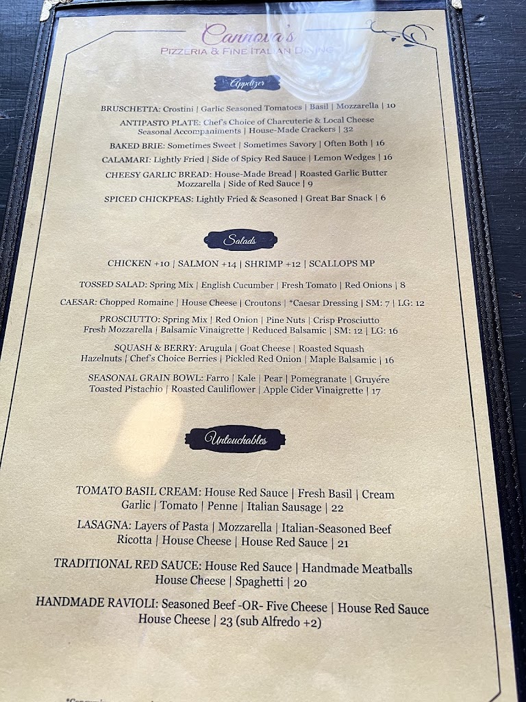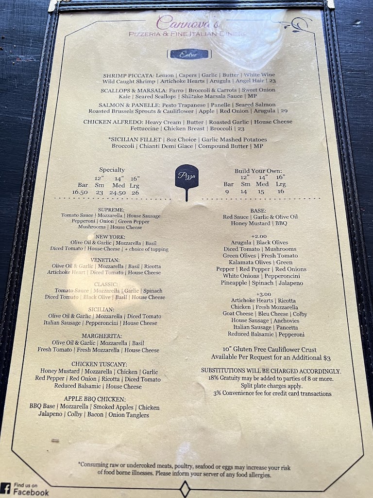 We always enjoy Cannova’s. Have never had a bad entree whether we ordered pizza or pasta. It’s all delicious! If you like dressing with your salad l suggest asking for it on the side because they are very generous with it. If you are there when the piano music is live, that’s wonderful. The outdoor seating is private and cute. All around it’s just one of our favorites!