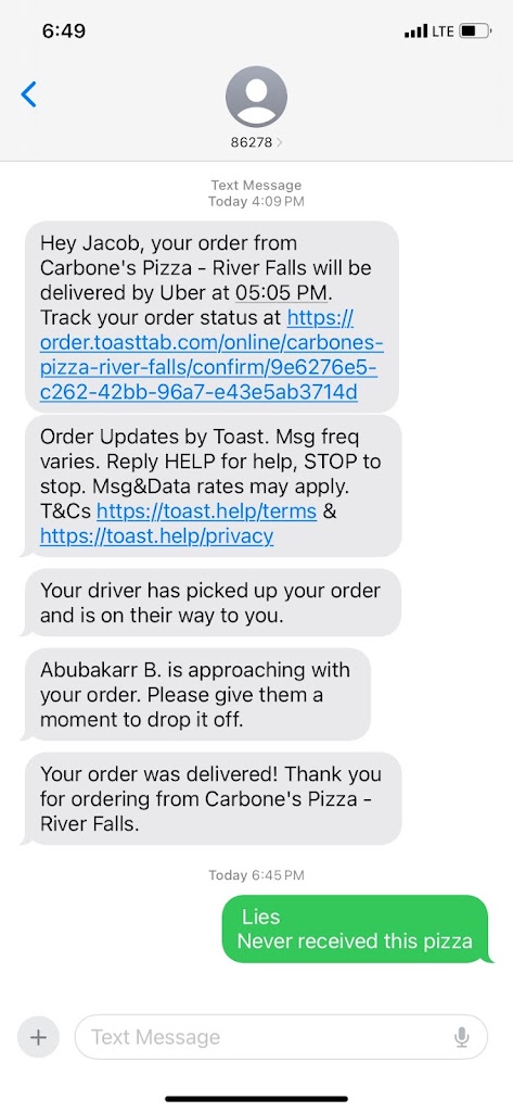Sent my pizza to the wrong hotel room I never received my order and they wouldn't credit my card. They stated that it was delivered in the time alottled. Yeah to the wrong f$&@ing room. Place is ran my idiotic kids. Never will I order from them again. I travel for work and always looked forward to having carbones pizza when I Came to town. Not anymore!
