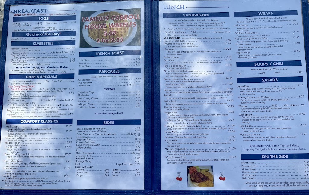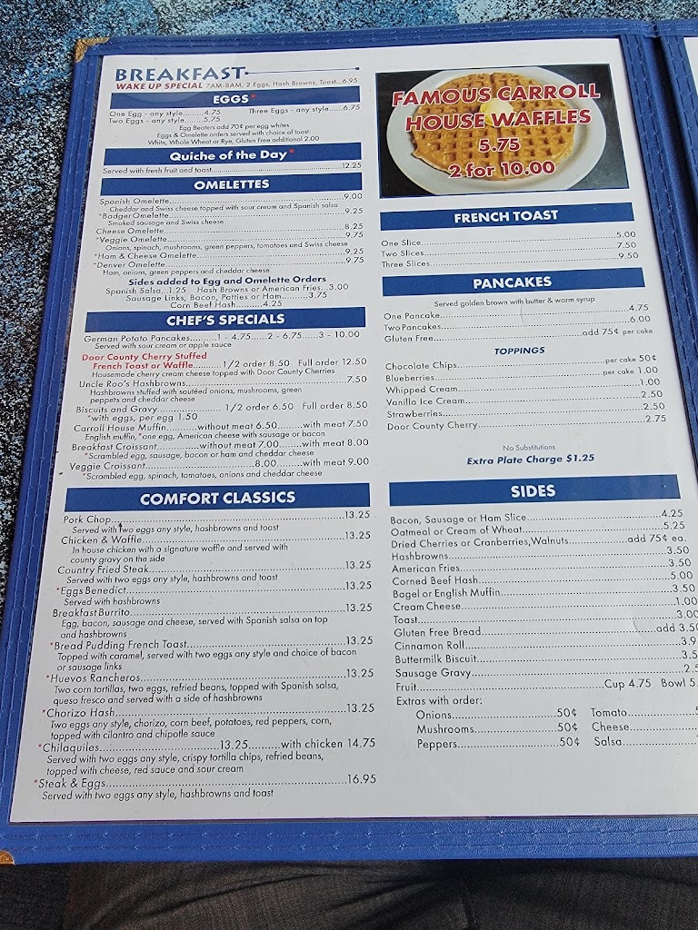 We stayed around the corner at the Birchwood, and the staff highly recommended Carroll House. They were right. On a Sunday morning when the more "Touristy" places had a 90-minute wait for a table for two, Carrol House got us in with no wait. I'm informed the potato pancakes were excellent, and I had a half order of the cherry stuff waffles, with a side of hash browns. The only thing better than the food was the service. (And the fact that 90% of the customers appeared to be locals and not tourists like me)