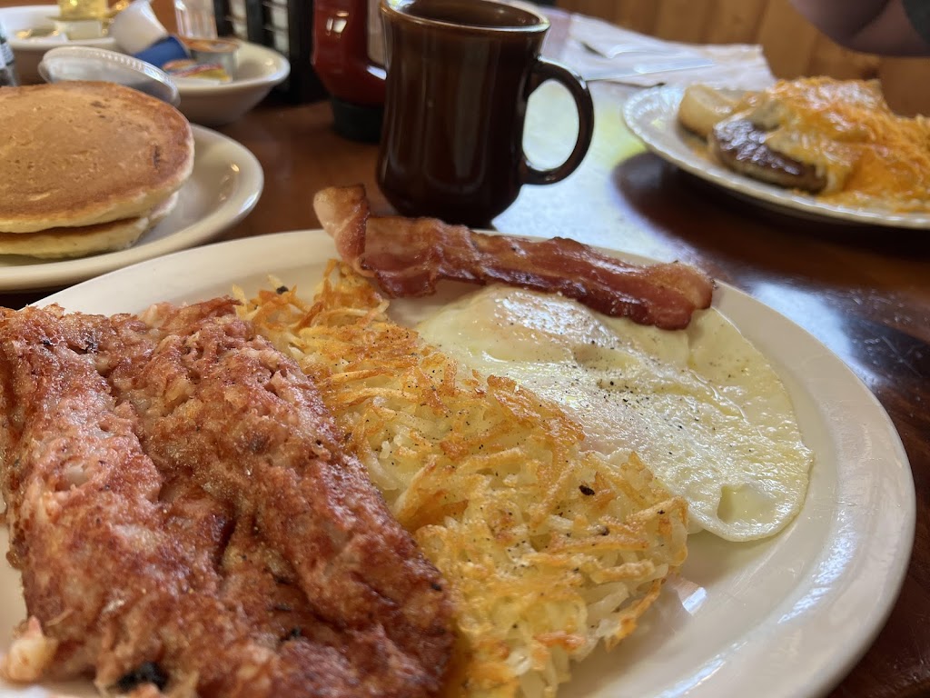 Good food served promptly and for a decent price. Large meatlovers platter for $10, steak and eggs for $11. Coffee served hot and often. Easy to find and plenty of available parking. Very enjoyable.
