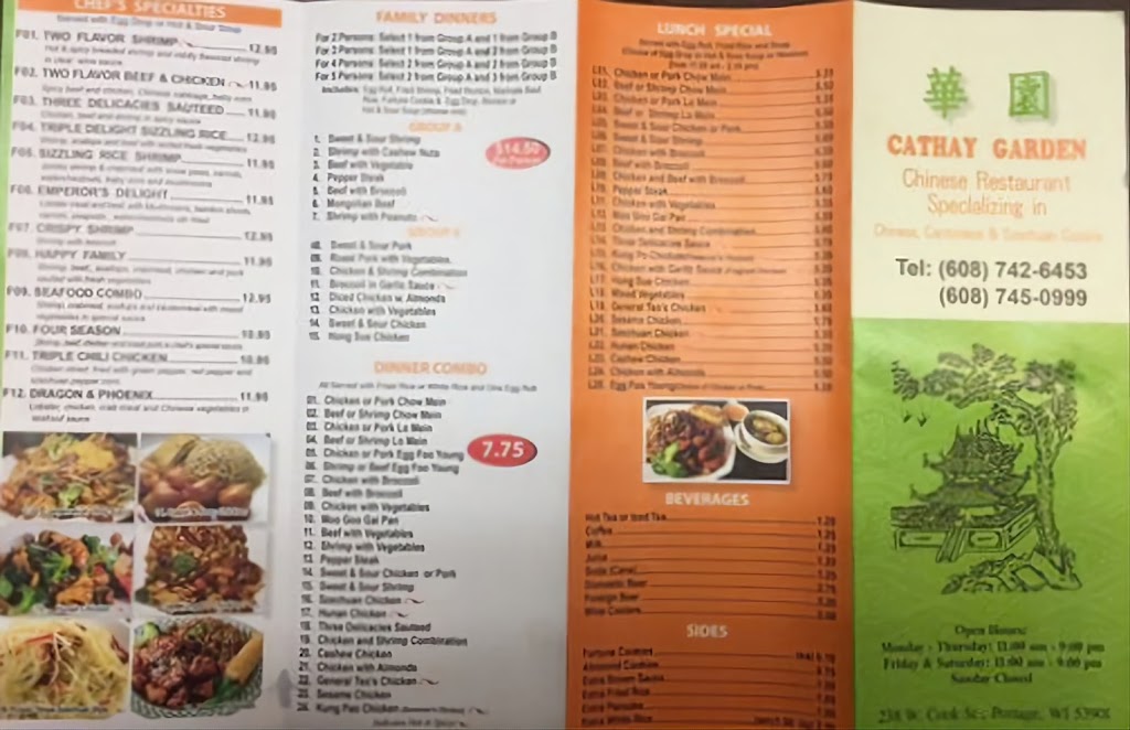 We stopped at Cathay Garden Restaurant on our return trip from Tennessee. The food was delicious and the staff was very friendly and accommodating. For example, my husband’s request for less hot spice in his Kung Pao Chicken was granted and his meal was perfect. The portions were generous and the food fresh. I highly recommend this restaurant to anyone living in or passing through the Portage, Wisconsin area..