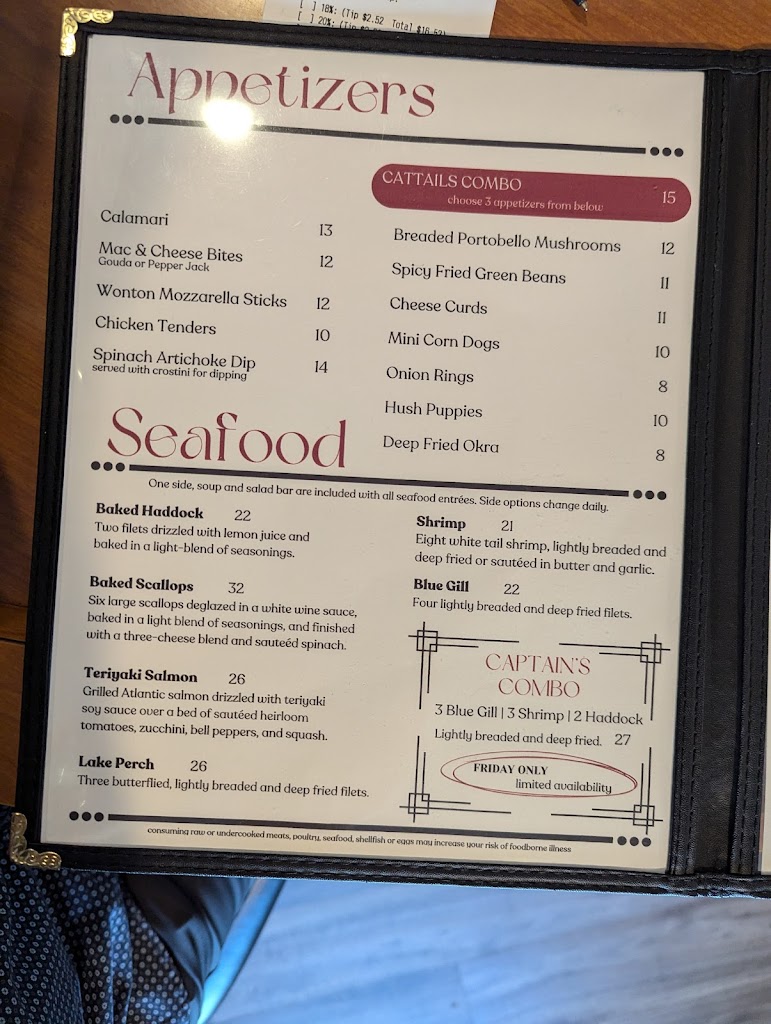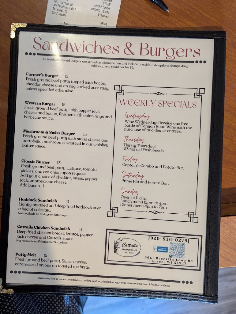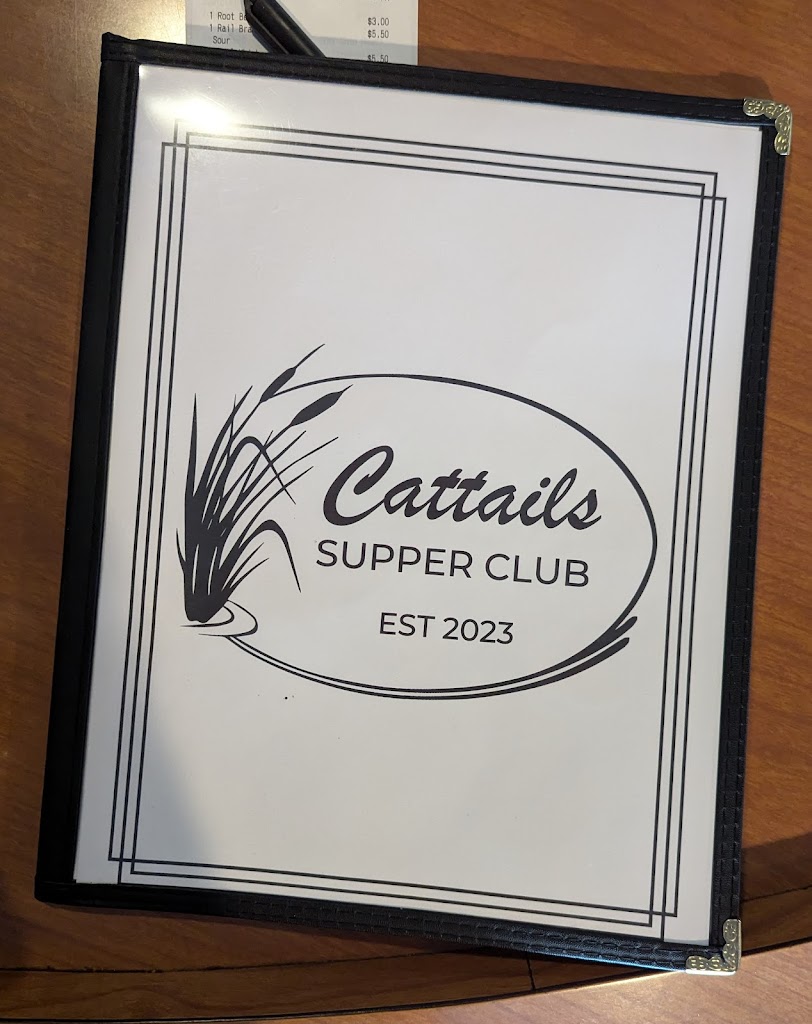 Went to Cattails supper club tonight. The food was fabulous. Husband had prime rib. I had baked haddock. Sides are offered at a side bar, along with a salad bar and homemade soup and rolls. The staff was wonderful and hospitable. We will be back. I finished my meal with a grasshopper. There was a nice seating area in the bar to visit before dinner.