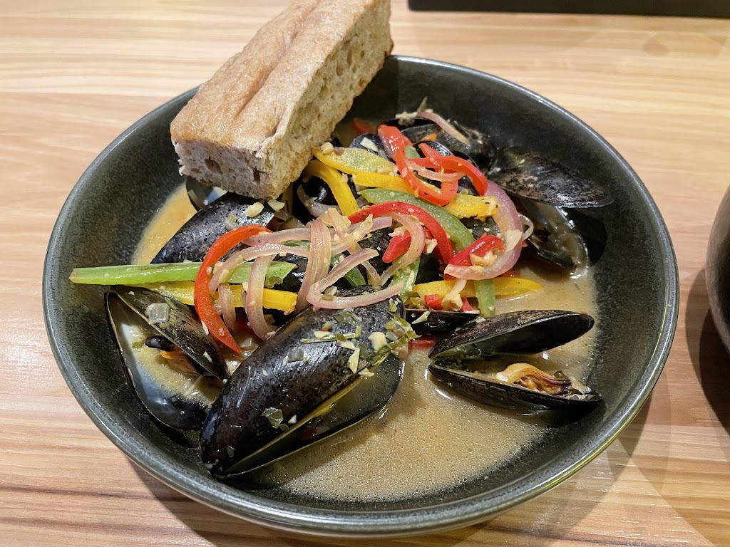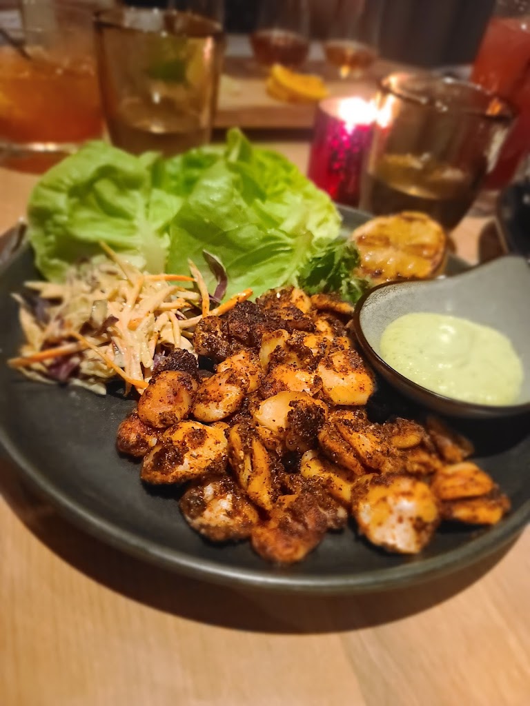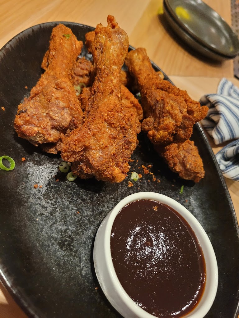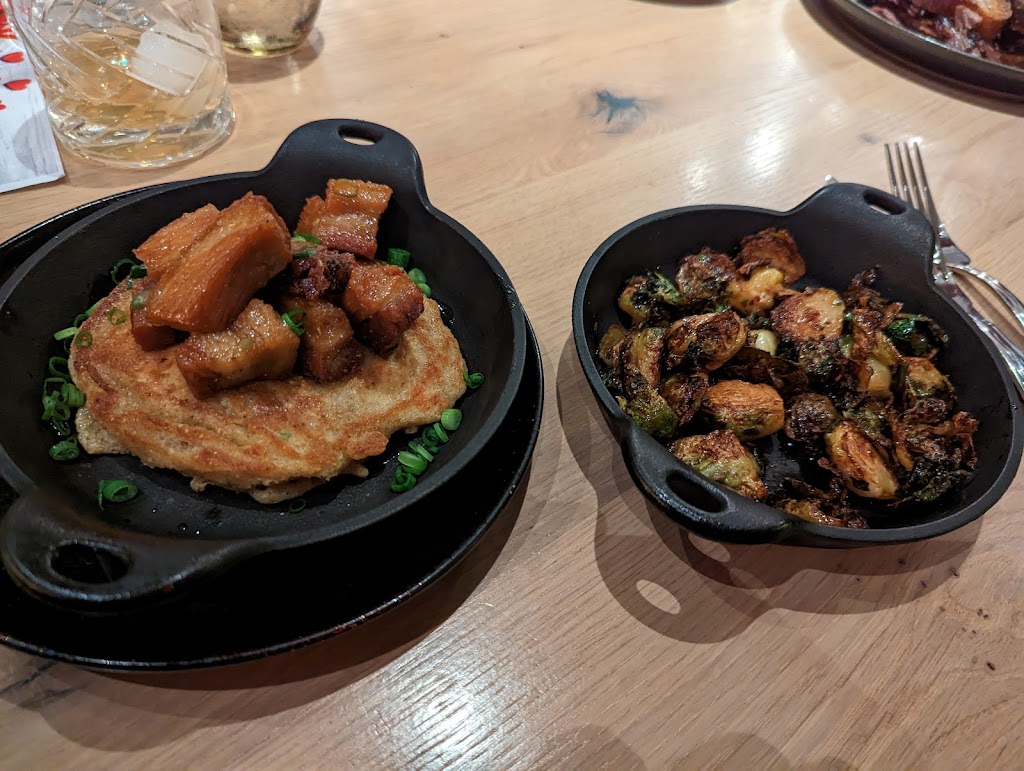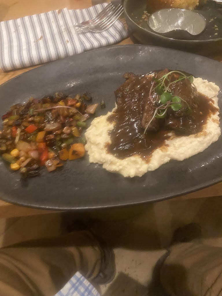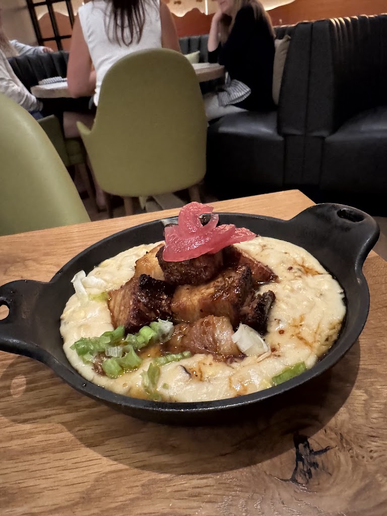 Our drinks—the Vanilla Old Fashioned, Patio Daddio, and Thoughtful Tropical mocktail—were all excellent. Creative, balanced, and enjoyable. The real star of the night, though, was the Crispy Pork Belly appetizer ($17). Served over roasted creamed corn with a maple mustard glaze, it was absolutely phenomenal—crispy, rich, and full of flavor.