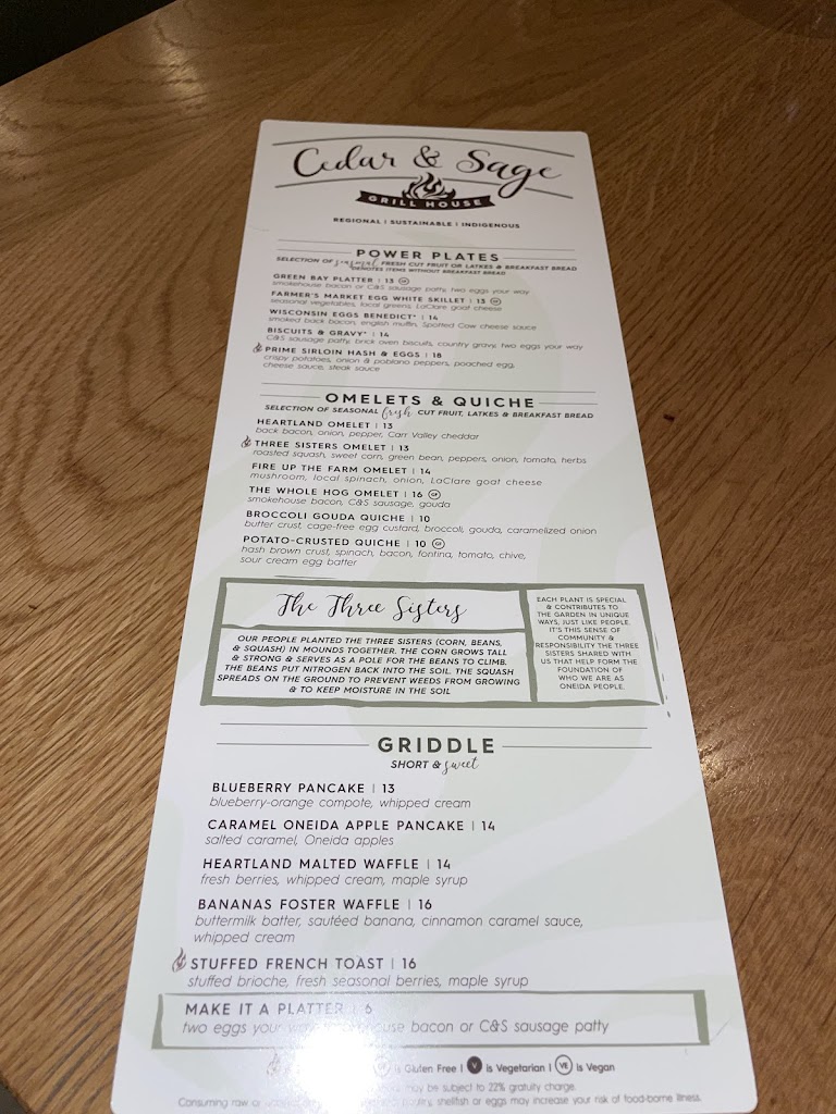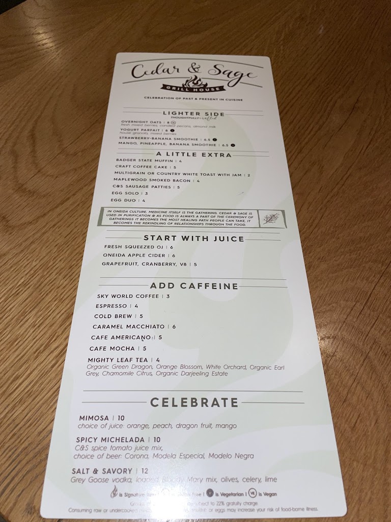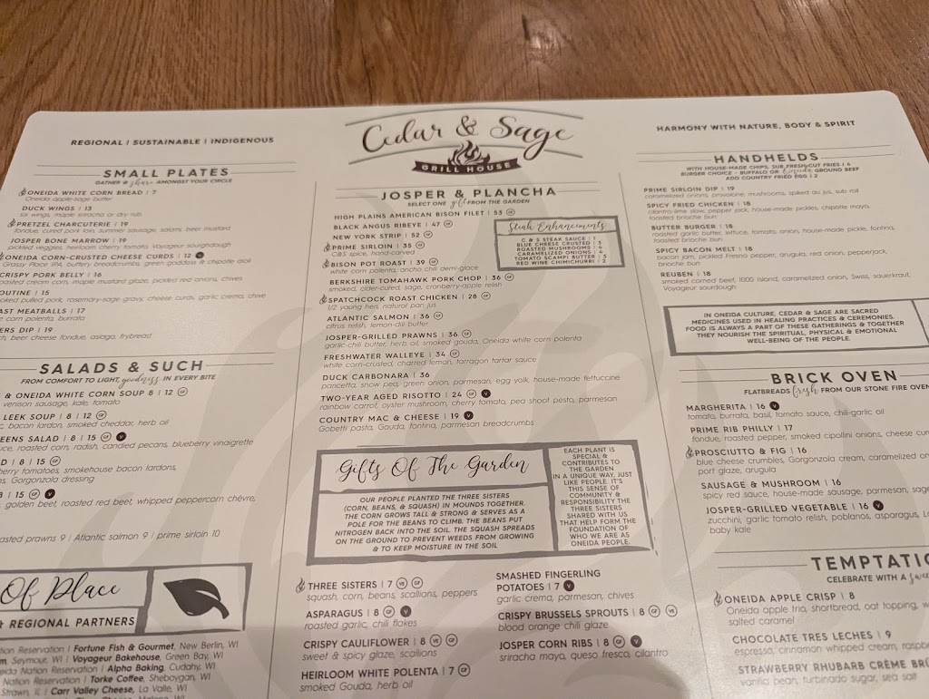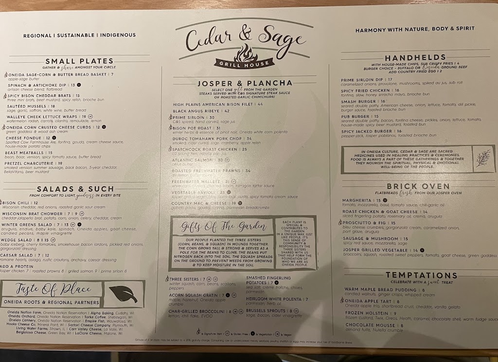 Enjoy the best the region has to offer at Cedar & Sage Grill House, located inside Oneida Casino & Hotel. Driven by indigenous and regional ingredients, delivered with true Wisconsin hospitality, and featuring a unique "taste of place," Cedar & Sage is perfect for casual meals, business meetings, intimate dinners, and everything in-between! We are open for breakfast daily, lunch Monday-Saturday, and dinner Tuesday-Saturday.