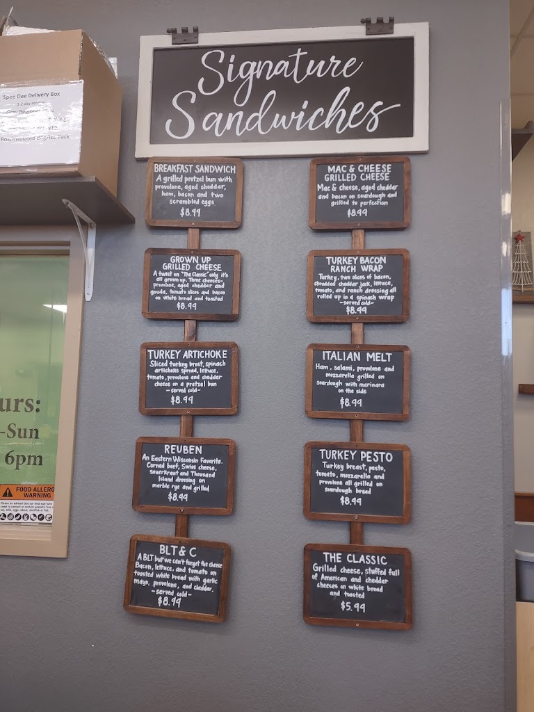 CHEESE CHEESE AND MORE CHEESE.... DID I MENTION CHEESE. We bought cheese and wine home. The food was great. Best cornbeef I've had in a while. The ice cream was delicious... cant forget the fried potato chips... yummy