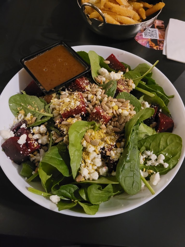 "Beet Street Salad" is The Best salad I've had since moving to Fond Du Lac! Everything was so fresh. The Spinach, roasted beets, pistachios, sunflower seeds, la clare farms, goat cheese & honey balsamic dressing. Amazing 😋*my brother's truffle fries hiding in back.