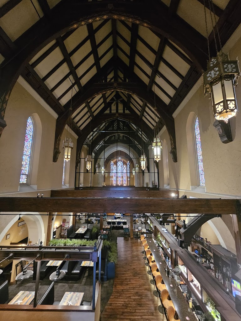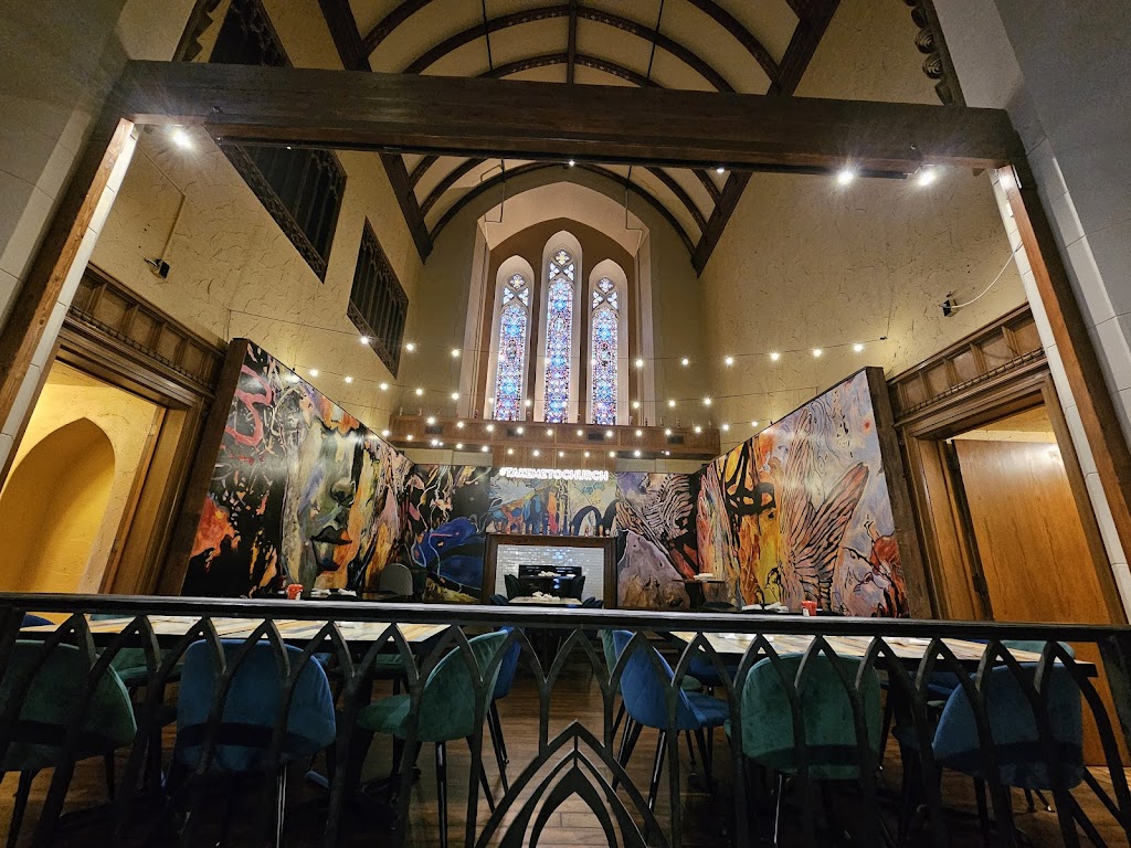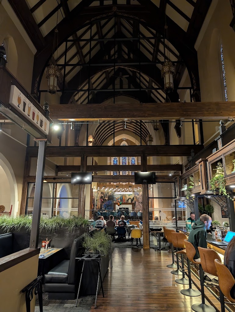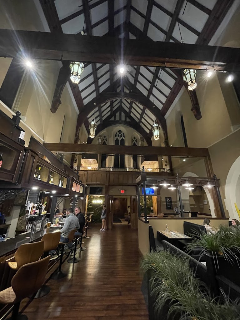 This place is worth the visit to see the building - very cool atmosphere in an old church! The food was pretty good but nothing that I will want to return for. The waitress (Sam) was very friendly and efficient. I had the Holy Water drink and it was good. We had one cocktail, and two entrees (asian salmon & Mexican style street carnitas tacos) for $60 plus tip.