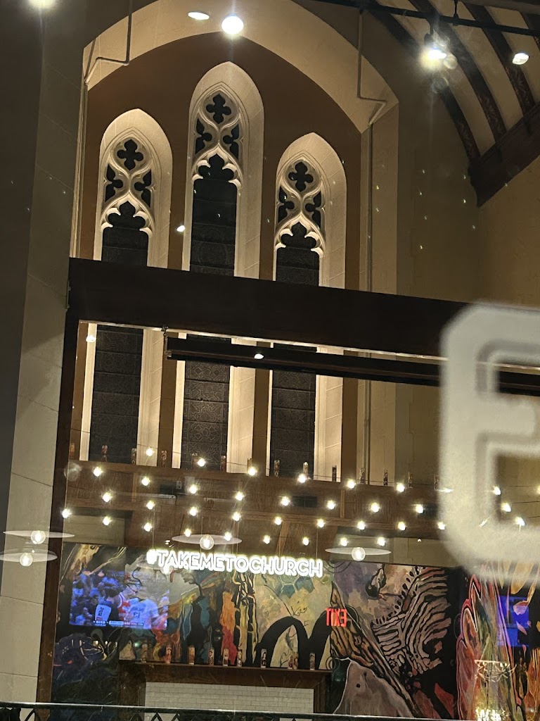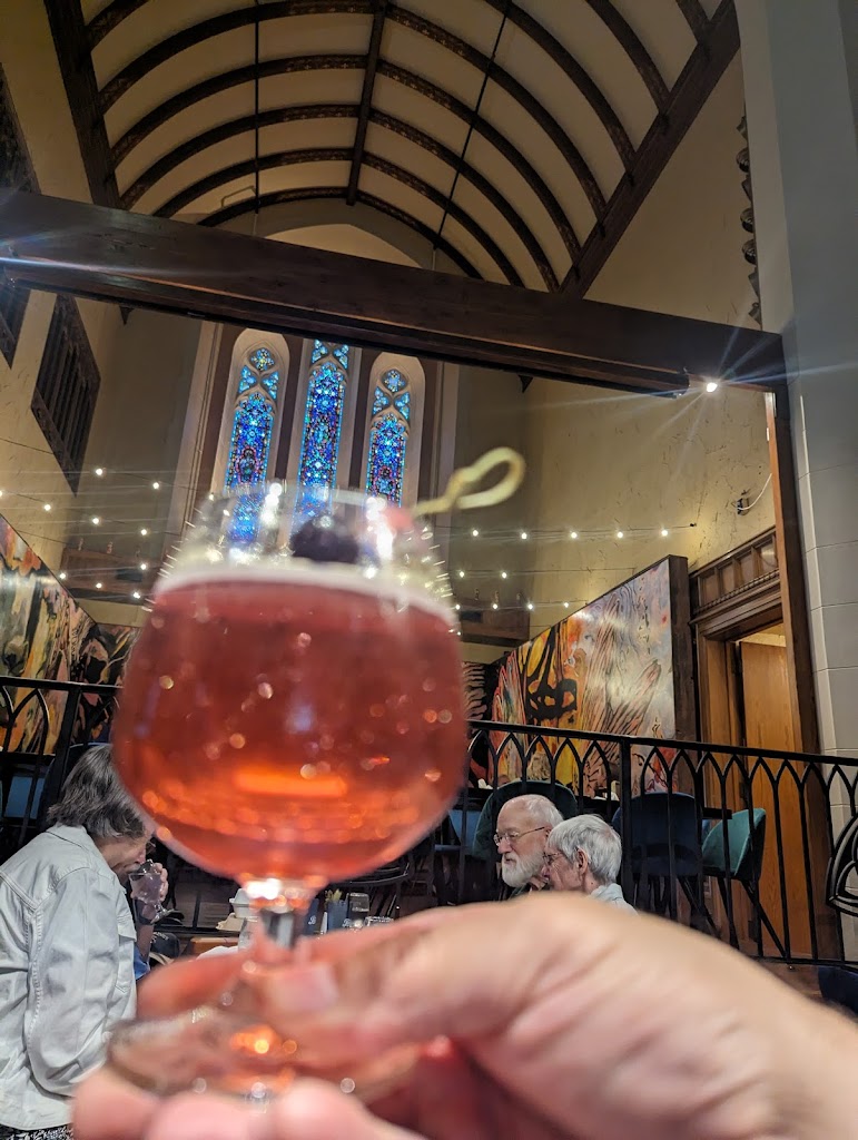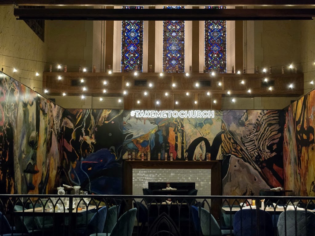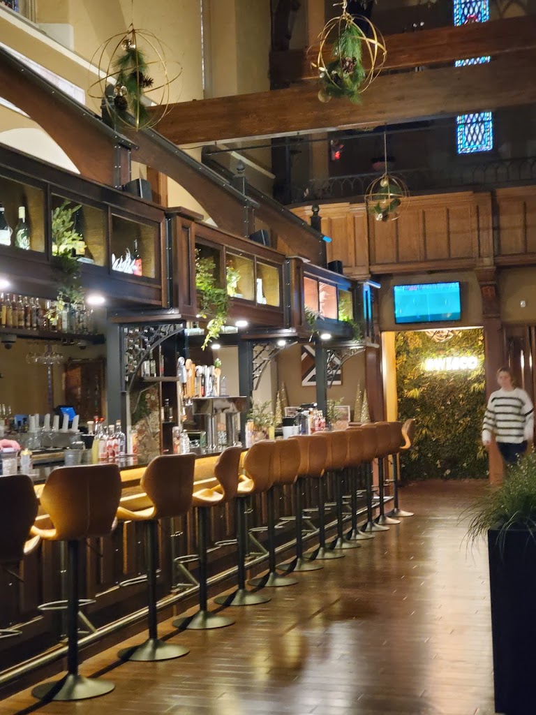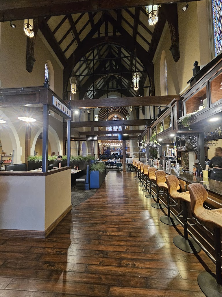 This place is worth the visit to see the building - very cool atmosphere in an old church! The food was pretty good but nothing that I will want to return for. The waitress (Sam) was very friendly and efficient. I had the Holy Water drink and it was good. We had one cocktail, and two entrees (asian salmon & Mexican style street carnitas tacos) for $60 plus tip.