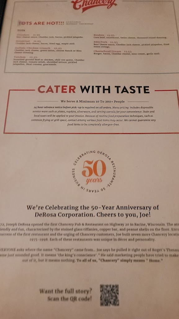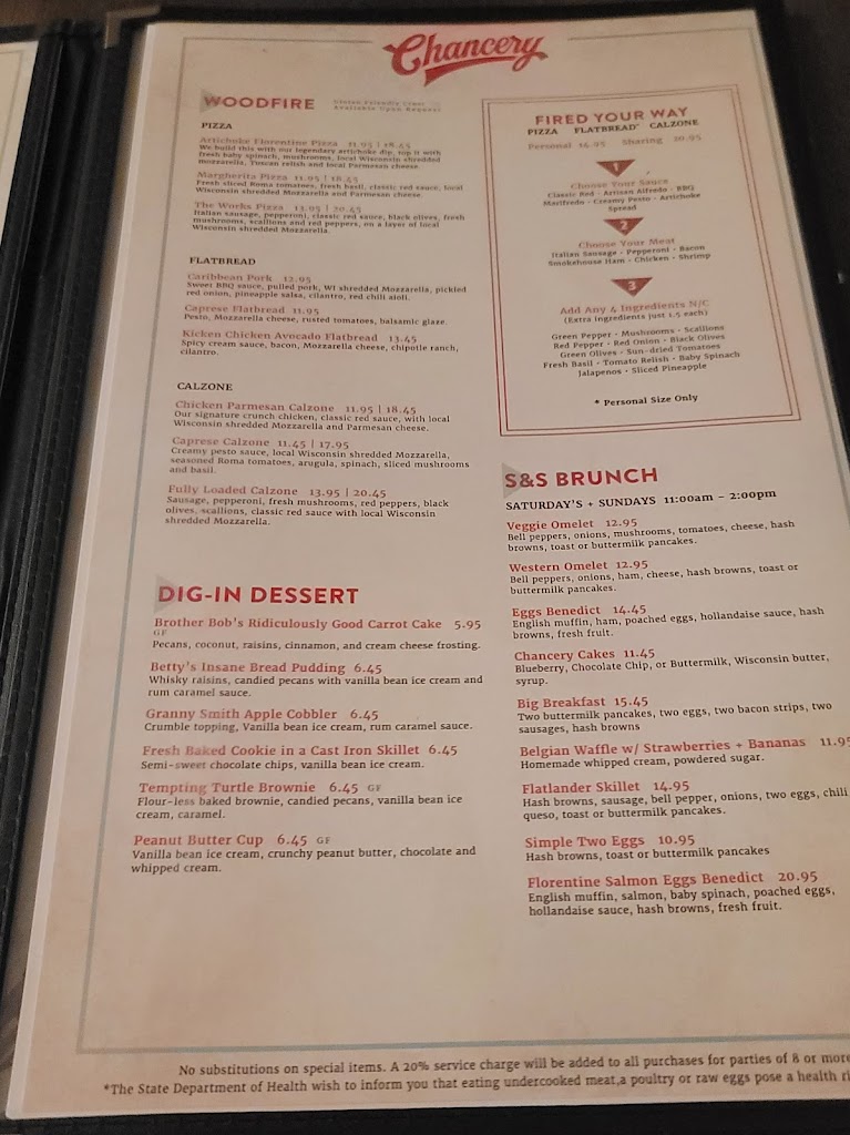 I used to love the chancery. The food has gone downhill. Not a lot of good menu choices. A lot of stuff taken off the menu. Service was not great. They were busy and not enough staff? Cleanliness was so so. There was a table with 2 sick, screaming, coughing, sneezing , clearly Ill children and it was a big turn off. If your kids are that sick, stay home. And if you don't have the sense to stay home, maybe the staff should be saying something. Several people complained about this besides us. And the staff did nothing about it. Terrible experience. Terrible food. I do not recommend.